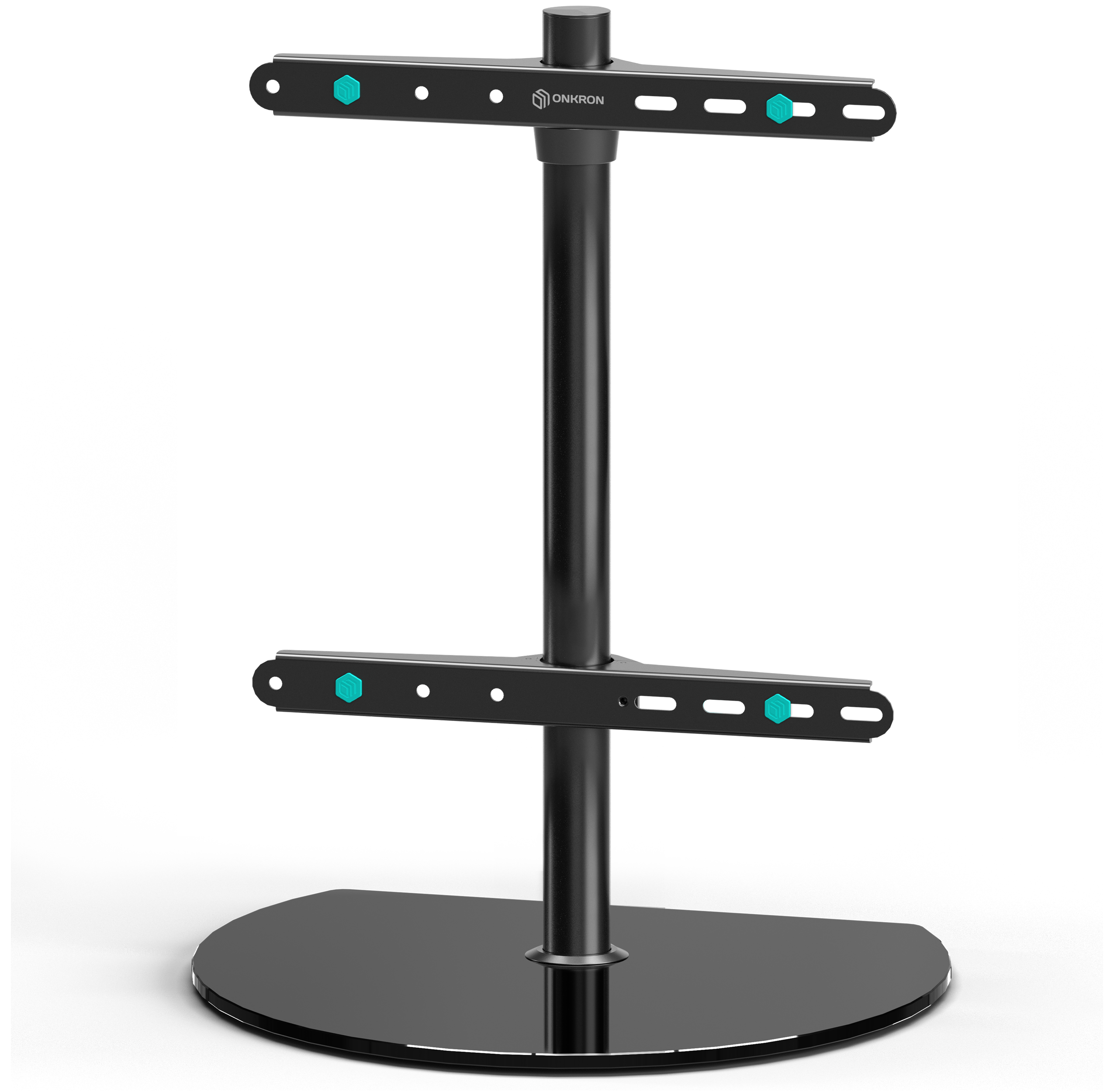 ONKRON PT2 to stojak na telewizor dla pomieszczeń wykonany ze stali walcowanej na zimno (SPCC) i hartowanego szkła dla telewizorów o wadze do 35 kg i przekątnej od 32″ do 65″.