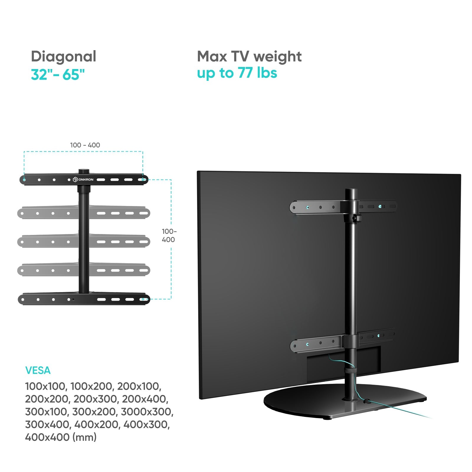 ✔️UNIWERSALNA KONSTRUKCJA: Podstawa pod telewizor pasuje do większości płaskich lub zakrzywionych ekranów LCD, LED o przekątnej 32-65 cali z otworami montażowymi VESA o wymiarach od 100×100 mm (min) do 400×400 mm (maks). Położenie telewizora można swobodnie regulować na całej wysokości słupa (62 cm) za pomocą śruby z tyłu kolumny.