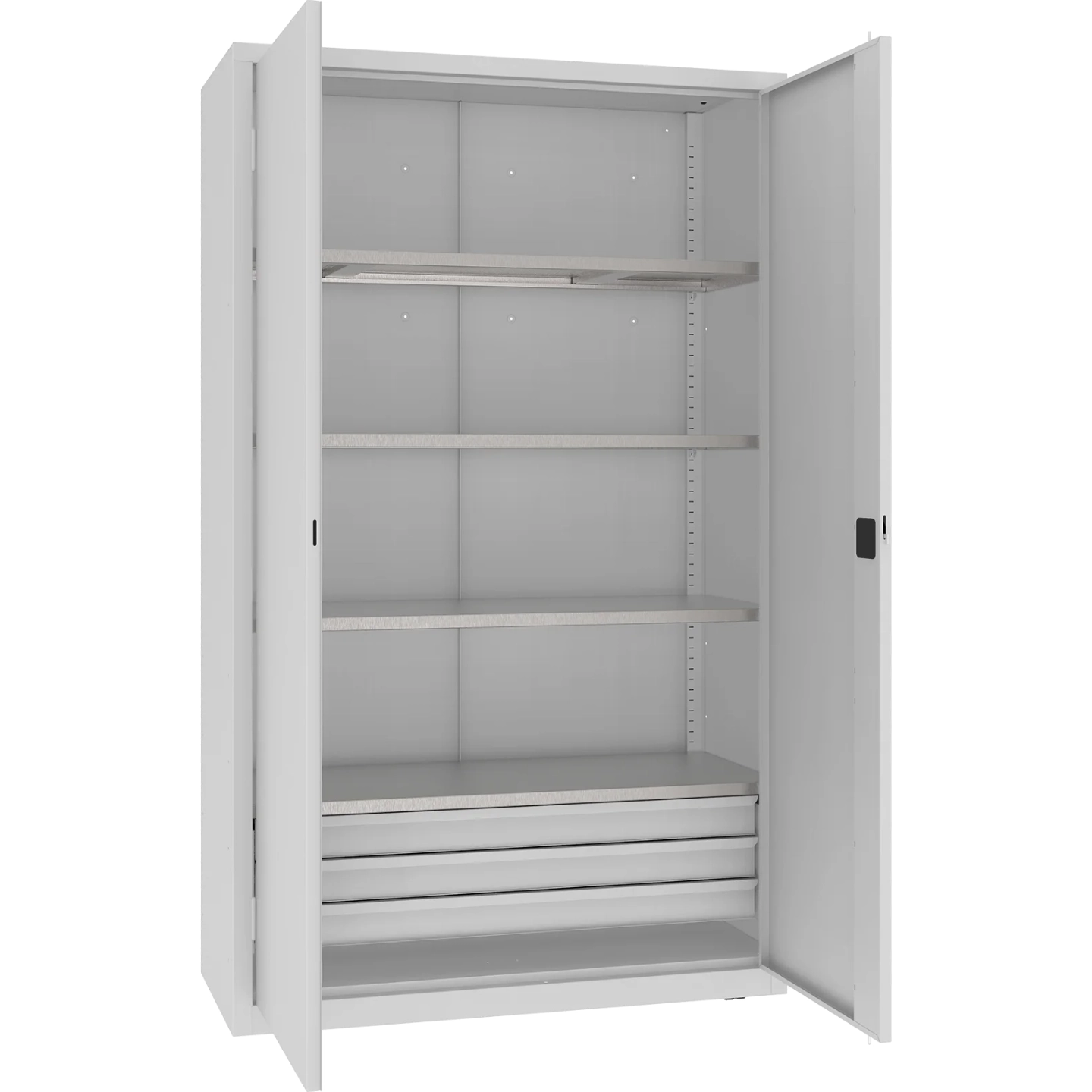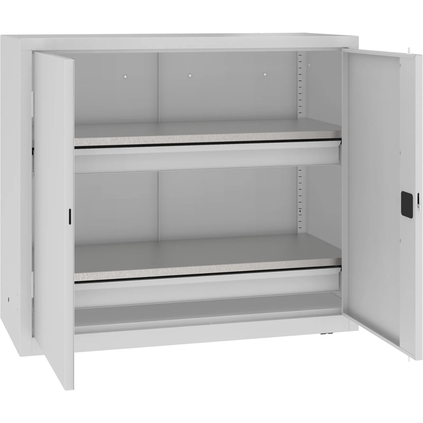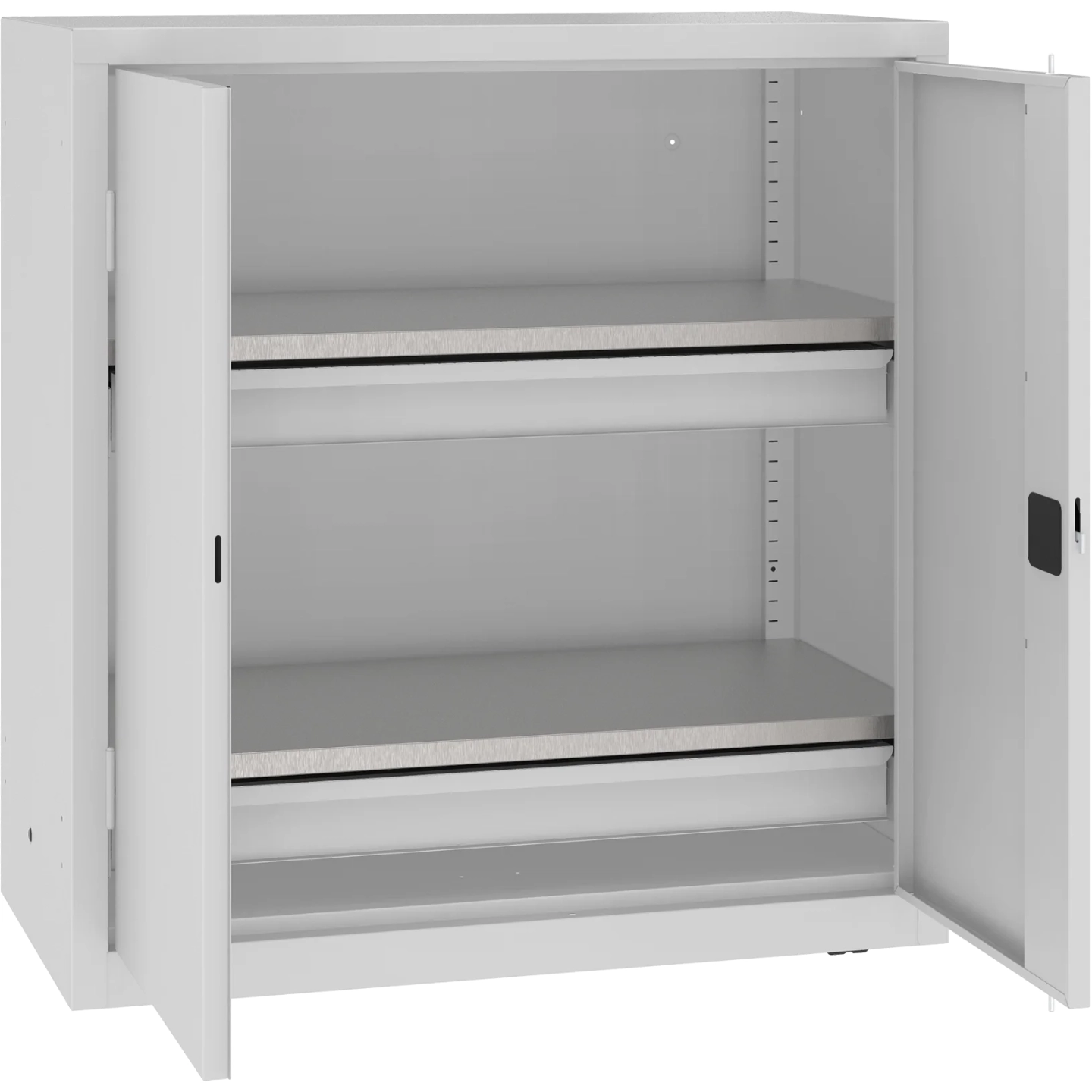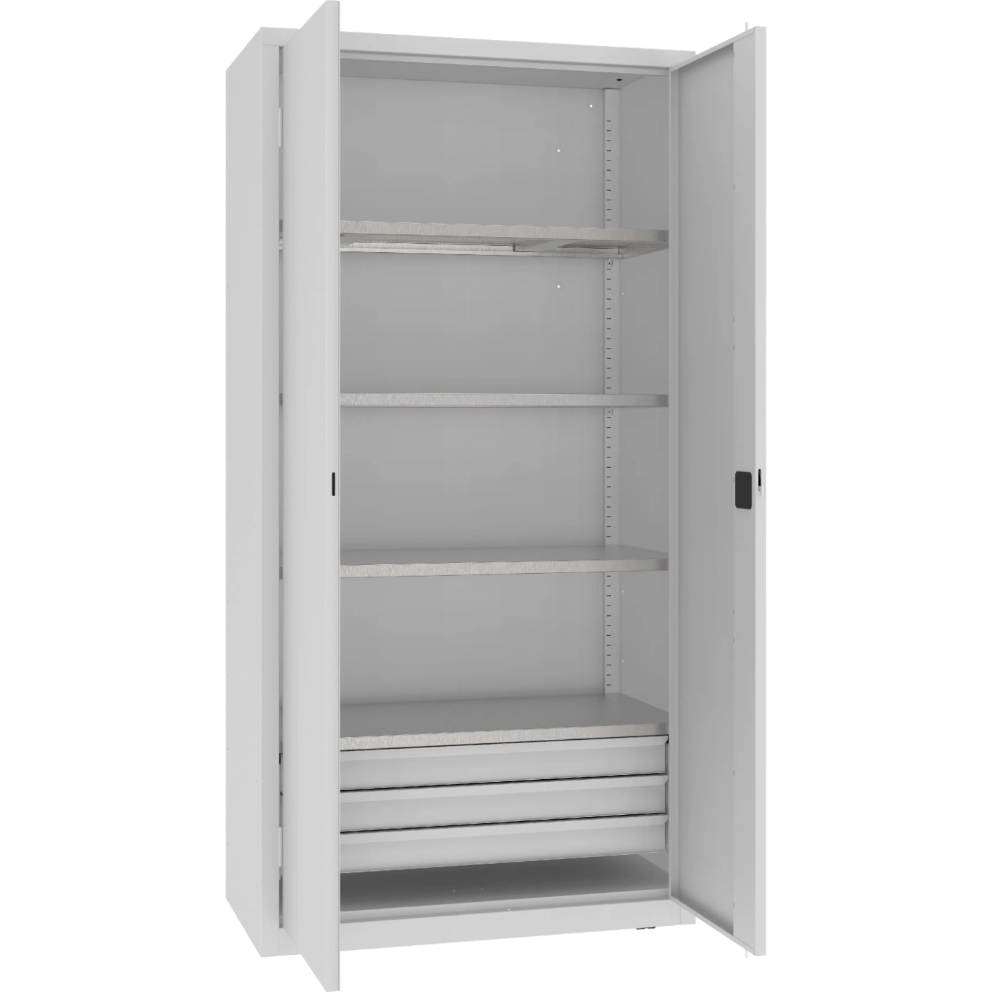 Wzmocnione, ocynkowane półki o nośności 100 kg każda oraz solidne szuflady (40 kg) pozwalają na wygodne i bezpieczne przechowywanie narzędzi. Drzwi skrzydłowe z 2-punktowym zamkiem skutecznie zabezpieczają zawartość. To sprzęt, który sprosta intensywnej eksploatacji każdego dnia.