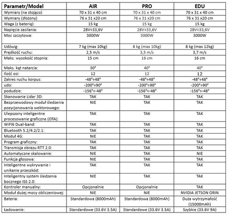 AI - O produkciePosłuchaj Porównanie poszczególnych modeli Unitree Go2: Parametr/Model AIR PRO EDU Wymiary na stojąco: 70 x 31 x 4…