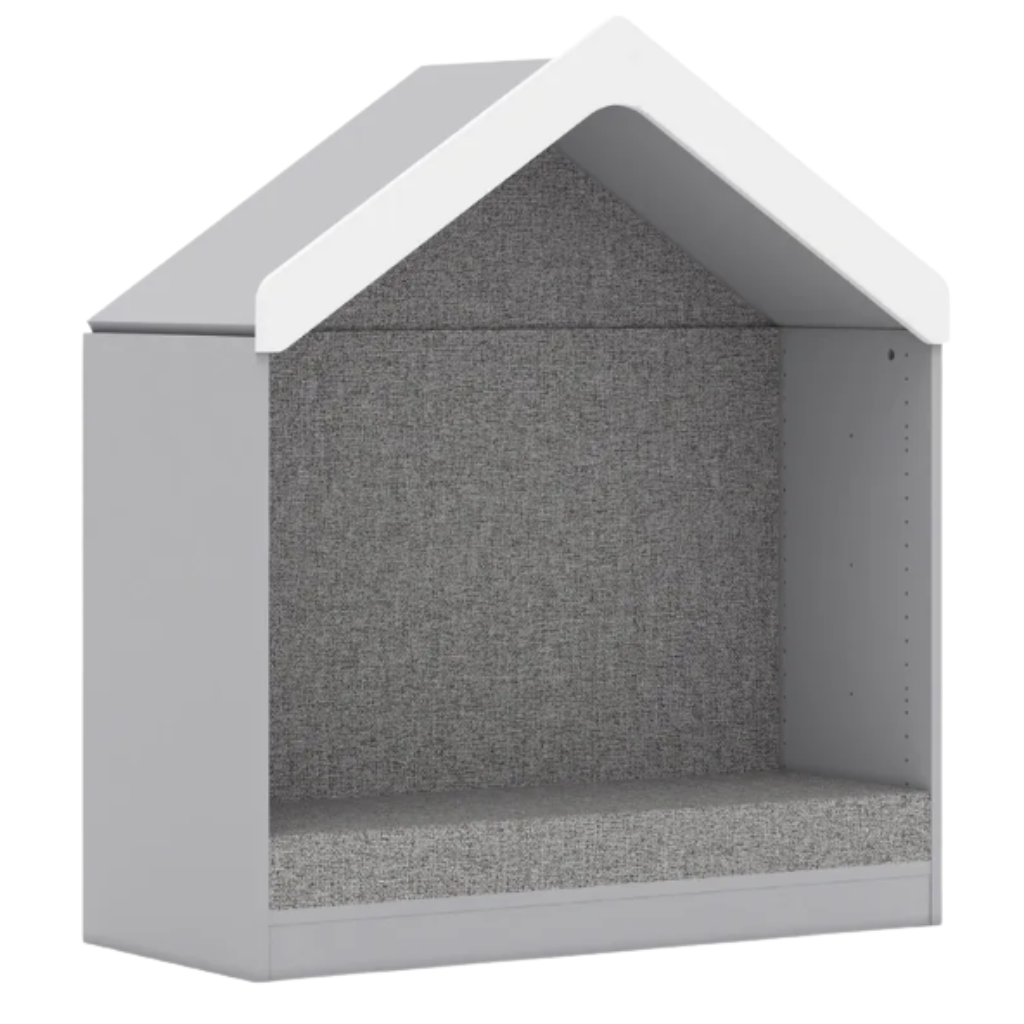 Domek tapicerowany o wymiarach 1049x466x1223 mm z korpusem wykonanym z płyty melaminowanej o grubości 18 mm, dostępny w kolorach: biały, szary, dąb kamienny. Plecy mebla z płyty meblowej stabilizujące mebel, umożliwiając jego bezpieczne użytkowanie jako siedziska. Montaż elementu odbywa się według prostego systemu RAFIX, czyli „wepnij element i zatrzaśnij”. Miękkie, tapicerowane siedzisko wraz z oparciem zapewniające komfort podczas siedzenia. Wypełnienie siedziska wykonane z usztywnionej pianki poliuretanowej odpornej na wgniecenia o gęstości 40 kg/m3. Pianka o grubości 50 mm obłożona tkaniną posiadającą certyfikat trudnopalności, wykonaną z poliestru 100% o gramaturze 370 g/m² i ścieralności 80 000 cykli lub tkaniną wykonaną z PCW 100% o gramaturze 550g/m² i ścieralności 30 000 cykli. Dostępna w 18 różnych kolorach, co pozwala na łatwe dopasowanie do każdego wnętrza. Cokół w kolorze korpusu chroniący dolne krawędzie mebla przed uszkodzeniami i zabrudzeniami. Daszek stanowi atrakcyjny dodatek do linii mebli BLOX. Korona daszka wykonana z solidnej płyty MDF o grubości 16 mm, malowana i lakierowana farbą posiadającą atest Polskiego Towarzystwa Alergologicznego (PTA). Przód i boki daszku w kolorze białym, tył w kolorze korpusu. Cała powierzchnia daszka posiada zaokrąglone krawędzie, uzyskane dzięki precyzyjnemu wycinaniu na ploterze frezującym, co zwiększa bezpieczeństwo użytkowania. Element przymocowany do korpusu mebla za pomocą elementów pośredniczących. Domek zapewnia wygodne miejsce do siedzenia i wyjątkowego charakteru.