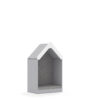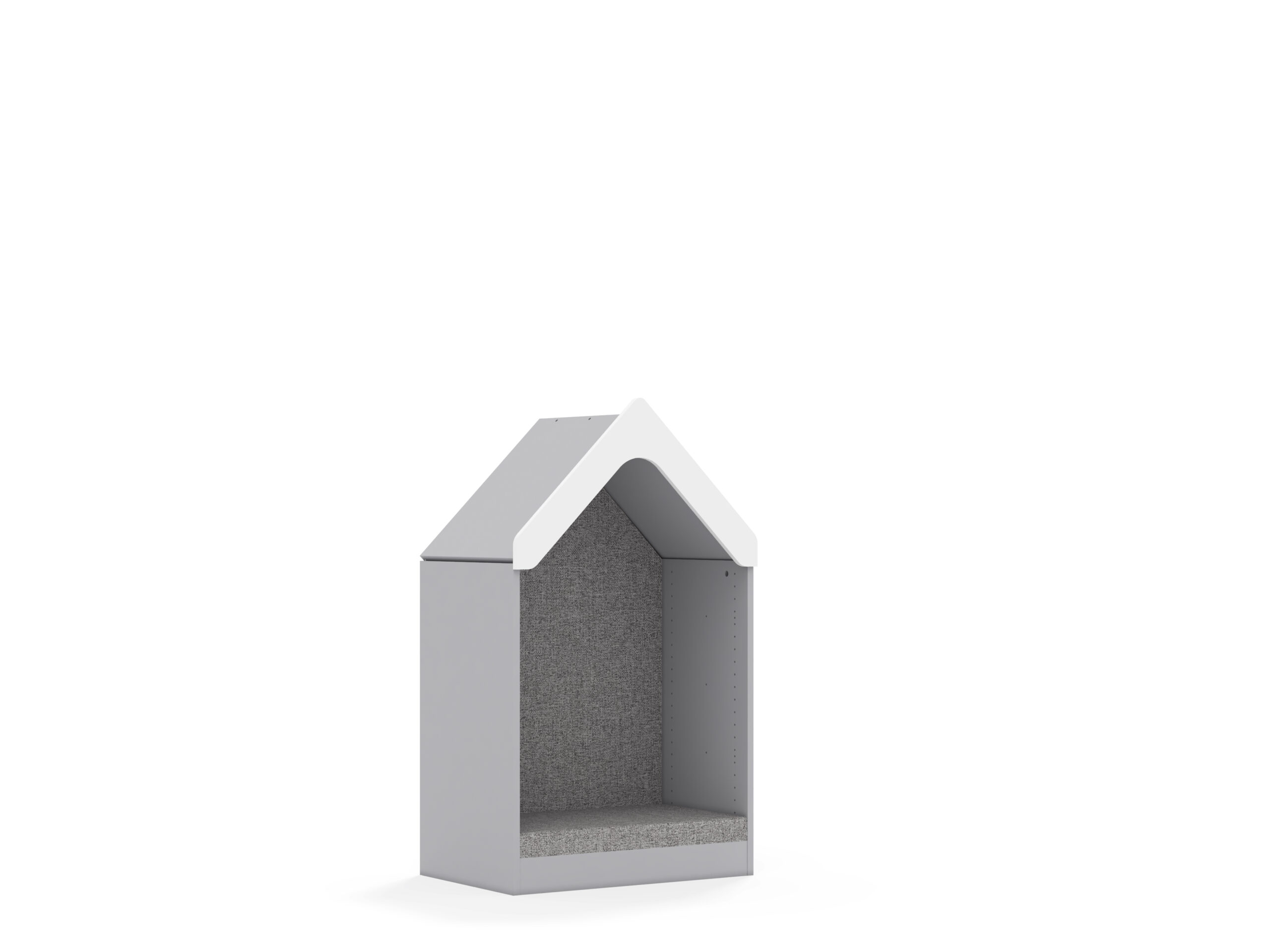 Domek tapicerowany o wymiarach 706x466x1223 mm z korpusem wykonanym z płyty melaminowanej o grubości 18 mm, dostępny w kolorach: biały, szary, dąb kamienny. Plecy mebla z płyty meblowej stabilizujące mebel, umożliwiając jego bezpieczne użytkowanie jako siedziska. Montaż elementu odbywa się według prostego systemu RAFIX, czyli „wepnij element i zatrzaśnij”. Miękkie, tapicerowane siedzisko wraz z oparciem zapewniające komfort podczas siedzenia. Wypełnienie siedziska wykonane z usztywnionej pianki poliuretanowej odpornej na wgniecenia o gęstości 40 kg/m3. Pianka o grubości 50 mm obłożona tkaniną posiadającą certyfikat trudnopalności, wykonaną z poliestru 100% o gramaturze 370 g/m² i ścieralności 80 000 cykli lub tkaniną wykonaną z PCW 100% o gramaturze 550g/m² i ścieralności 30 000 cykli. Dostępna w 18 różnych kolorach, co pozwala na łatwe dopasowanie do każdego wnętrza. Cokół w kolorze korpusu chroniący dolne krawędzie mebla przed uszkodzeniami i zabrudzeniami. Daszek stanowi atrakcyjny dodatek do linii mebli BLOX. Korona daszka wykonana z solidnej płyty MDF o grubości 16 mm, malowana i lakierowana farbą posiadającą atest Polskiego Towarzystwa Alergologicznego (PTA). Przód i boki daszku w kolorze białym, tył w kolorze korpusu. Cała powierzchnia daszka posiada zaokrąglone krawędzie, uzyskane dzięki precyzyjnemu wycinaniu na ploterze frezującym, co zwiększa bezpieczeństwo użytkowania. Element przymocowany do korpusu mebla za pomocą elementów pośredniczących. Domek zapewnia wygodne miejsce do siedzenia i wyjątkowego charakteru.
