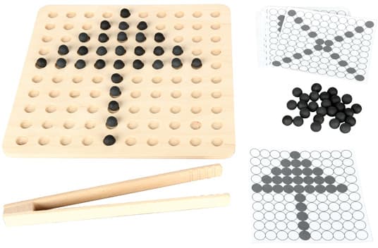 Ćwiczenia lewopółkulowe to grupa ćwiczeń polegająca na stymulowaniu lewej półkuli mózgu, która: analizuje, przetwarza linearnie, porządkuje sekwencyjnie, wykrywa relacje. Układanka polega na ułożeniu za pomocą szczypiec drewnianych kulek zgodnie z wzorem podanym na obrazku, na drewnianej tabliczce. Kontrastowe kolory przykuwają uwagę dziecka, a sposób układania zachęca do działania. Układanka doskonale ćwiczy sprawność ręki, prawidłowy chwyt oraz koordynację wzrokowo-ruchową. Układanie wzorów stymuluje rozwój pamięci i percepcji wzrokowej, umiejętność postrzegania przedmiotów w przestrzeni oraz postrzegania relacji przestrzennych. Układanka doskonale sprawdzi się w pracy z dziećmi wymagającymi ćwiczeń percepcyjnych i koordynacyjnych – z uczniami z zaburzeniami procesów uczenia się (dysleksja, dysgrafia, dysortografia), z zaburzeniami koncentracji uwagi, autyzmem i zespołem Aspergera.