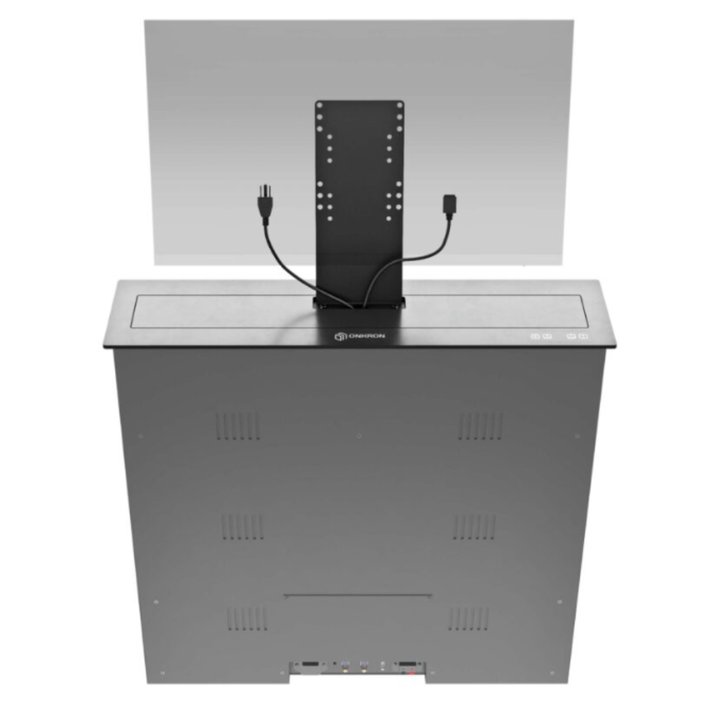 WYGODA: Możesz podnosić i opuszczać jeden lub kilka monitorów za pomocą jednego przycisku na pilocie (dostępny osobno). Mechanizm podnoszenia przyda się w instytucjach edukacyjnych, przestrzeniach coworkingowych, salach konferencyjnych i pokojach spotkań.