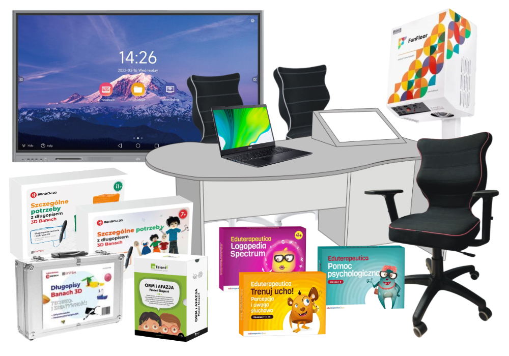Ergonomiczne stanowisko do terapii grupowej + pakiet programów multimedialnych wspomagających pracę z uczniem + Monitor 65" + Lapt…