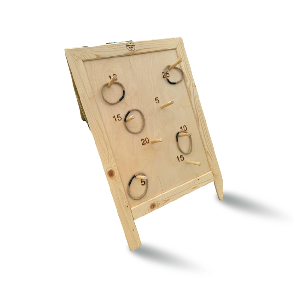 Drewniana gra rzut do celu w zestawie zawiera 5 kółek do rzucania.