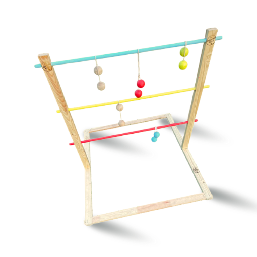 Drewniana gra sznurki-kulki w zestawie zawiera 5 zestawów piłek drewnianych, 6 nakrętek motylkowych oraz 1 klucz do motylków.
