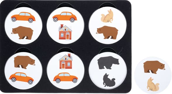 Grafitki to kolorowe, wykonane z grubego kartonu plansze z 4 lub 6 wyjmowanymi kółkami, pod którymi znajduje się identyczny rysunek, jak na kółku. Rysunki na różnych kółkach tworzą podobne do siebie pary, których elementy różnią się jednak nieco kształtem lub kolorem. Zadaniem dziecka jest włożyć kółka na właściwe miejsce.