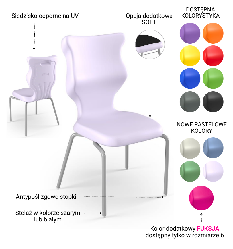 | Kolor siedziska | Czarny, Czerwony, Fioletowy, Jasny szary, Niebieski, Pastelowy fioletowy, Pastelowy niebieski, Pastelowy zielony, Pomarańczowy, Szary, Zielony, Żółty |