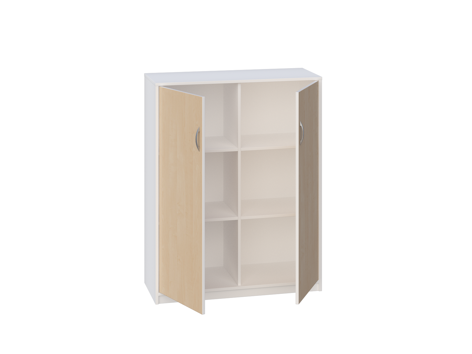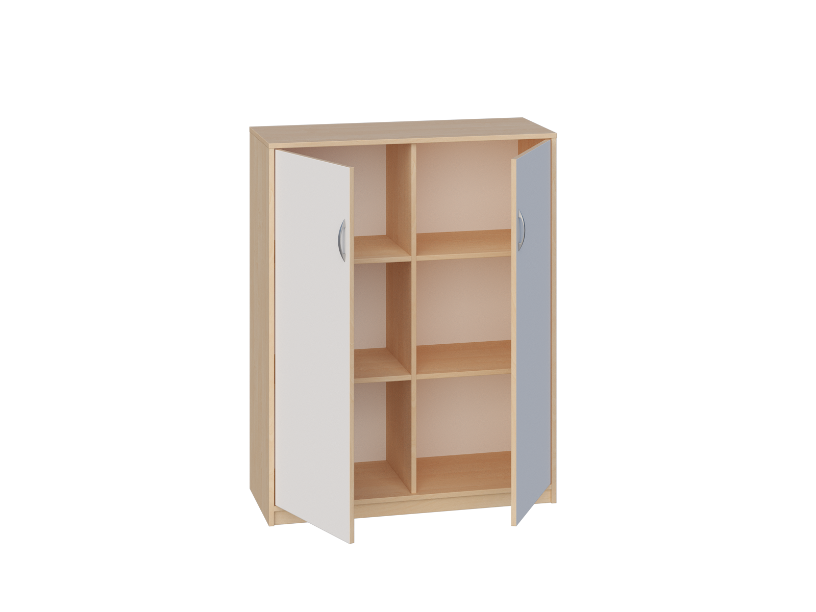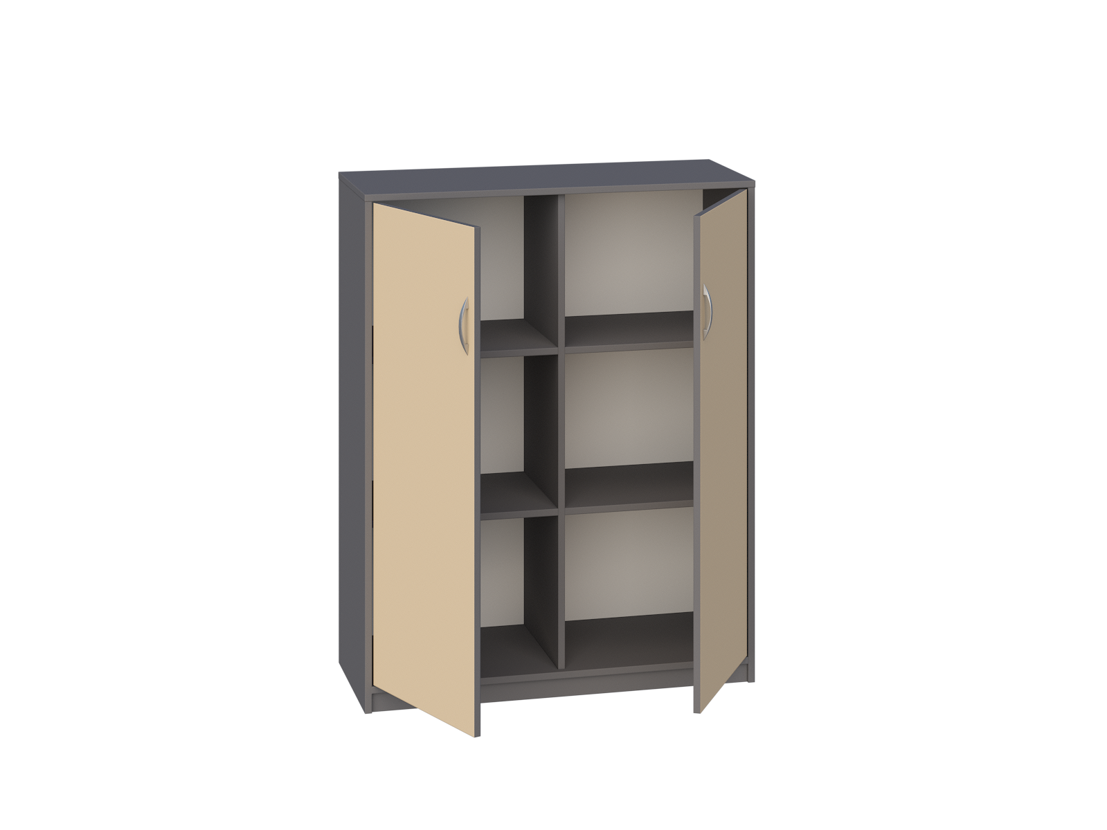 Wyposażona jest w 1 przegrodę oraz 4 półki, które łącznie tworzą 6 pojemnych przestrzeni, zamykanych parą drzwi bez zamka.