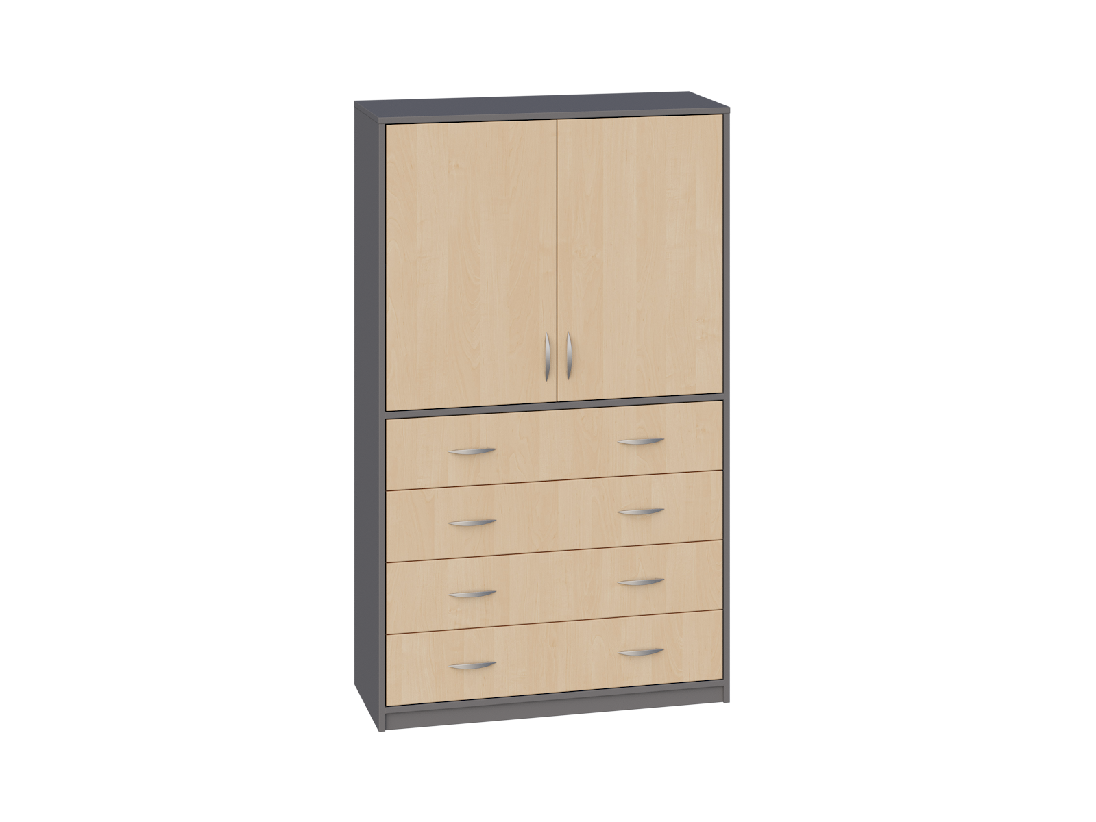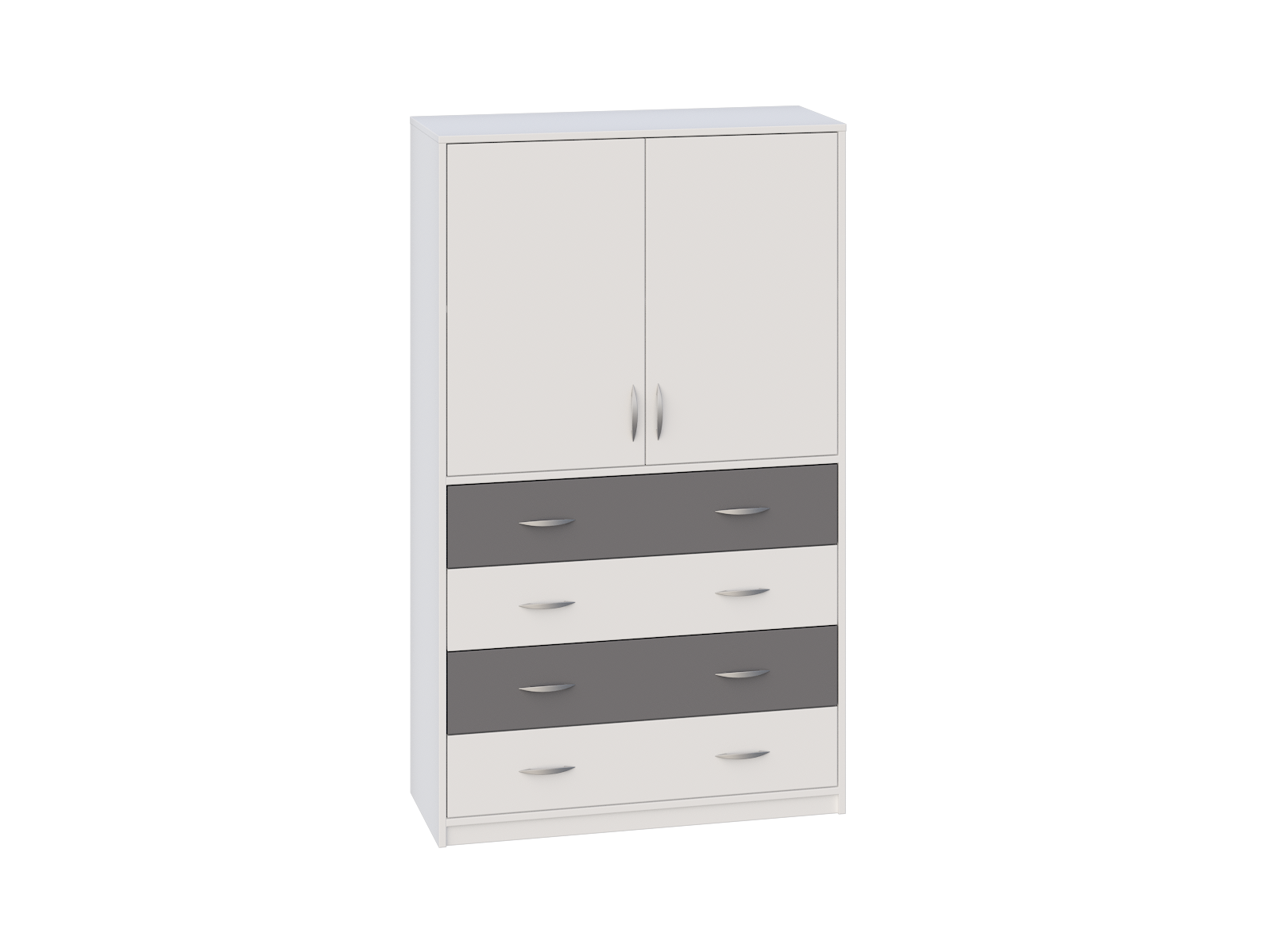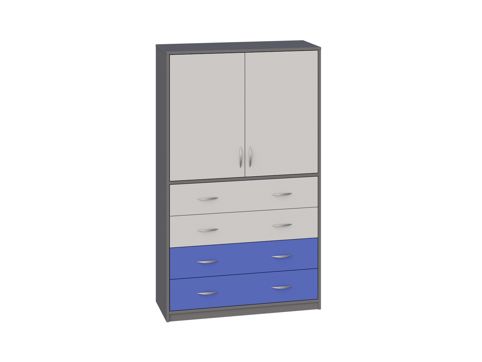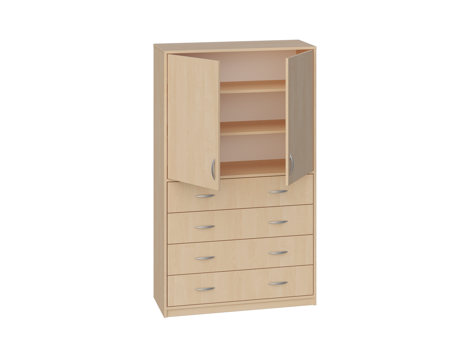 W górnej części posiada 3 przestrzenie półkowe zamykane parą drzwi bez zamka, natomiast dolna część wyposażona jest w 4 pojemne szuflady z pełnym wysuwem prowadnic.