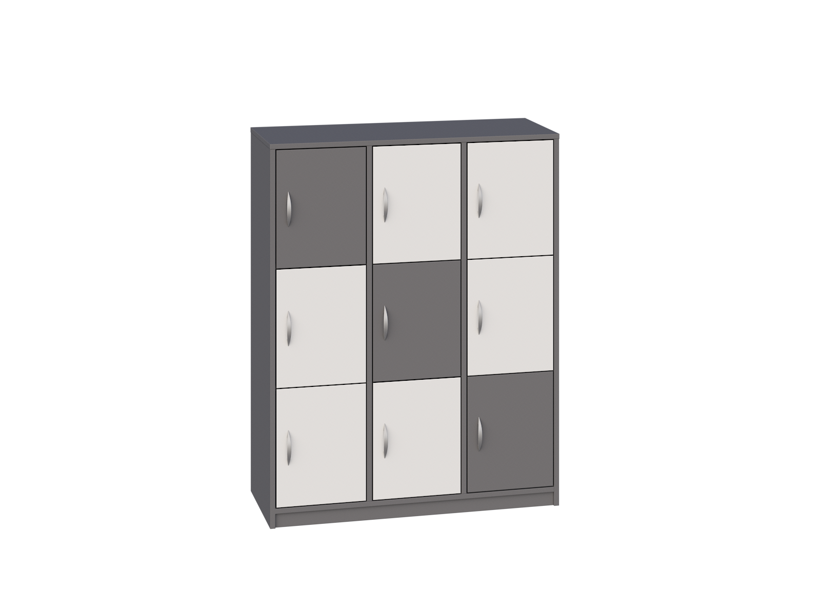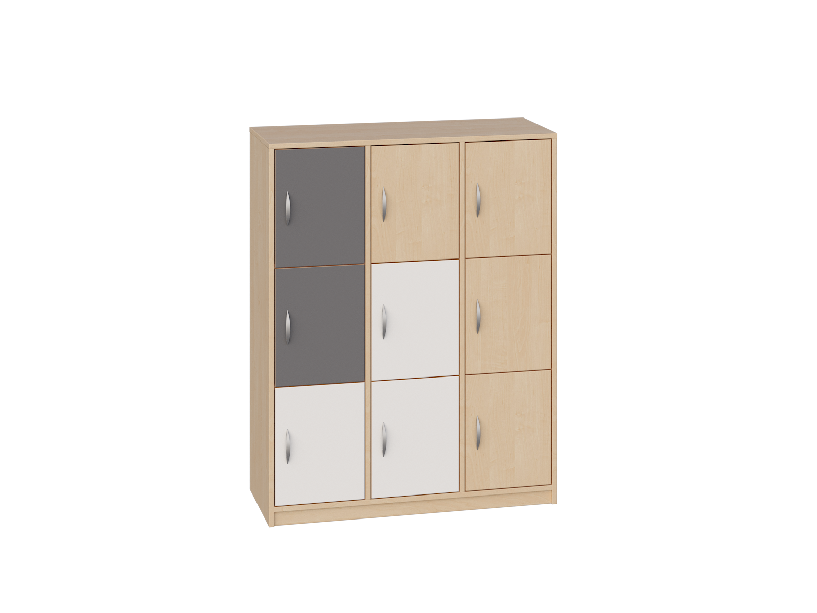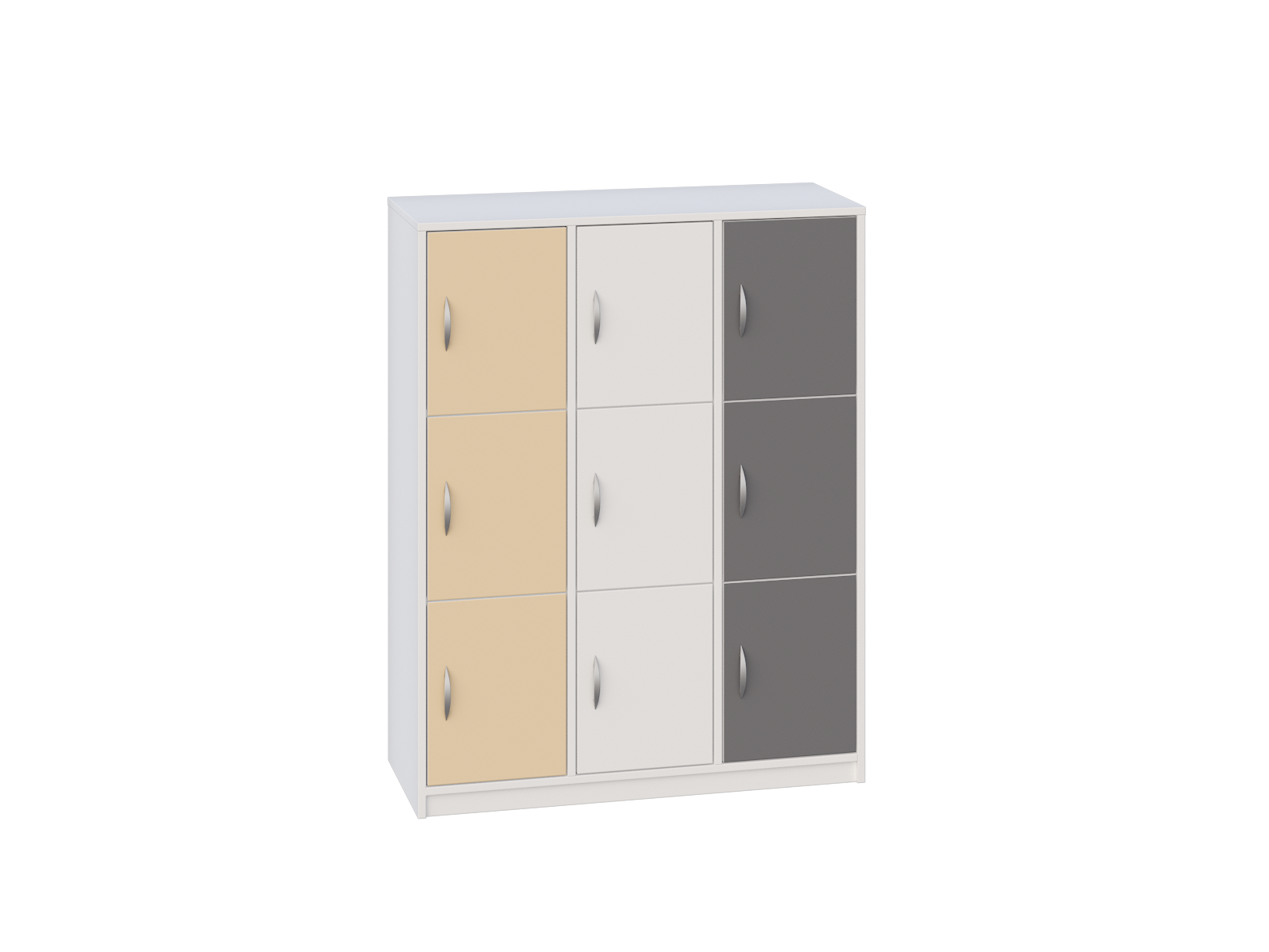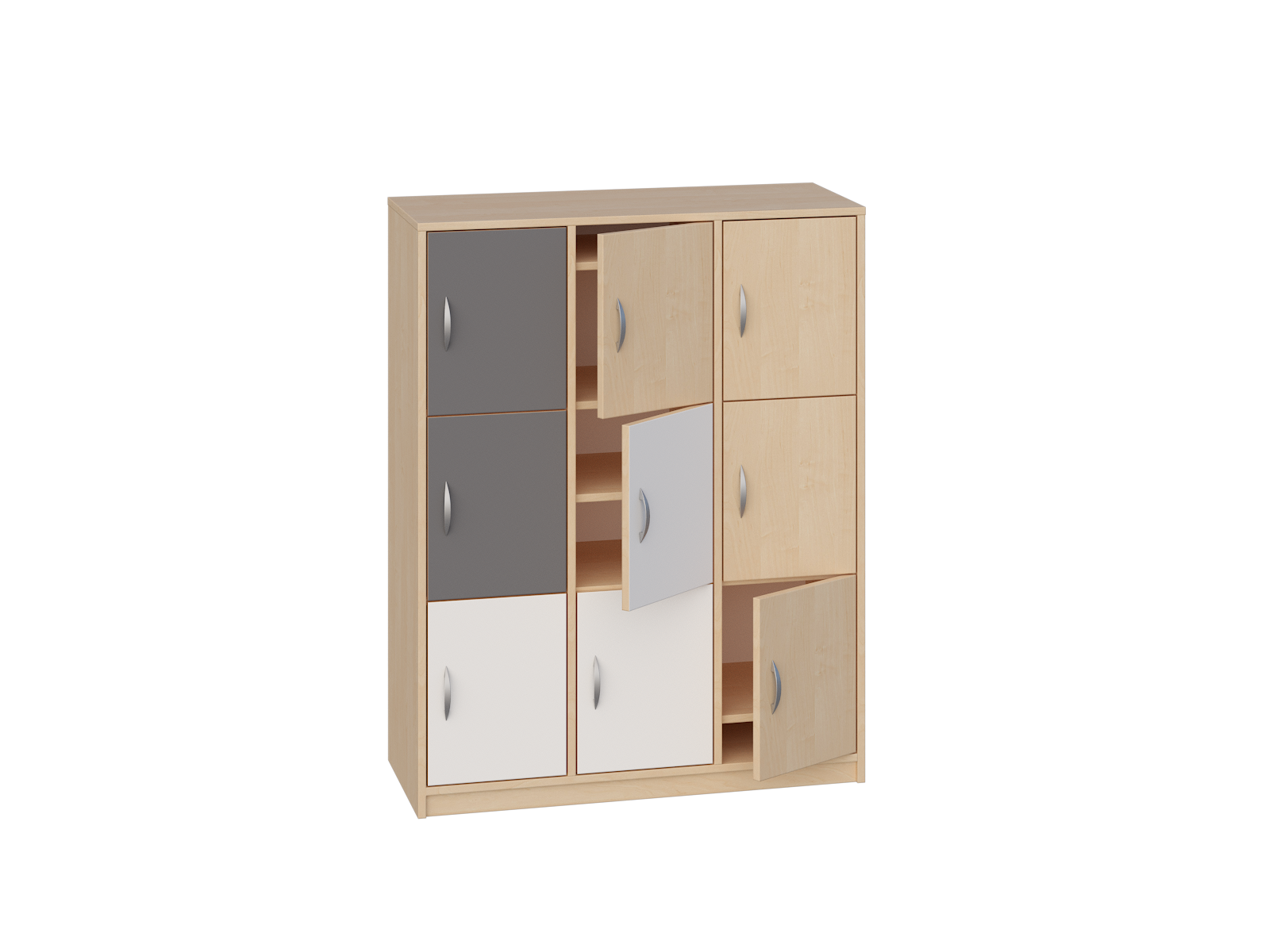 Posiada 2 przegrody i 6 półek, które tworzą łącznie 9 schowków do przechowywania, zamykanych drzwiczkami bez zamka.