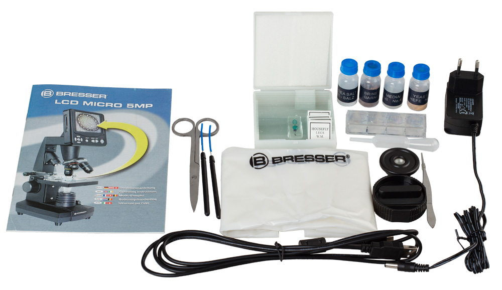Mikroskop Bresser LCD 50x-2000x jest dostarczany wraz z bogatą gamą akcesoriów niezbędnych dla każdego początkującego biologa.