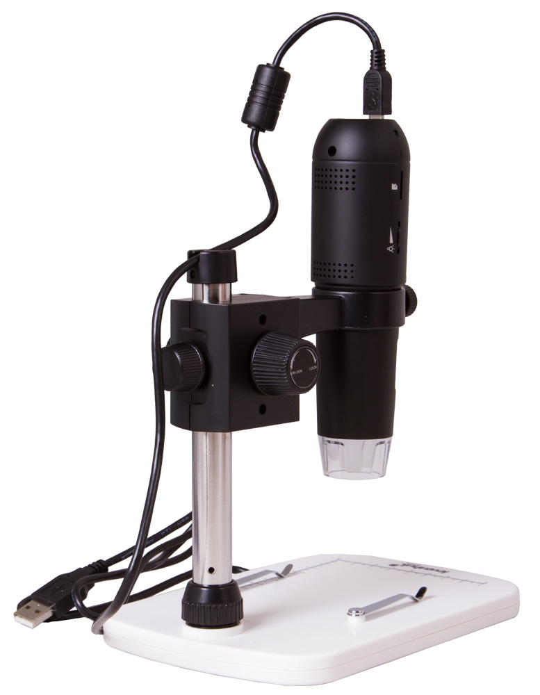 Do mikroskopu dołączony jest wygodny statyw. Montaż mikroskopu na statywie pozwala uzyskać lepszą jakość obrazu. W dolnej części statywu znajduje się stolik z metalowymi zaciskami i podziałką.