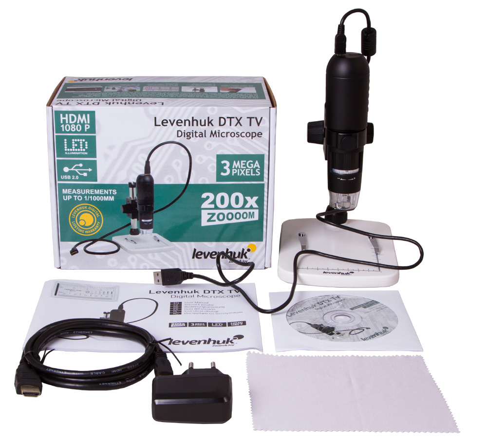 Levenhuk DTX TV to cyfrowy mikroskop pozwalający na obserwację badanych próbek na ekranie telewizora lub komputera. Zestaw obejmuje kable USB i HDMI, dzięki czemu możesz wybrać najwygodniejszą metodę połączenia. Mikroskop przesyła obrazy z soczewki obiektywu (gdzie są tworzone) na dowolny zewnętrzny ekran w czasie rzeczywistym. Levenhuk DTX TV to doskonały wybór do nauki, zabawy i pracy.