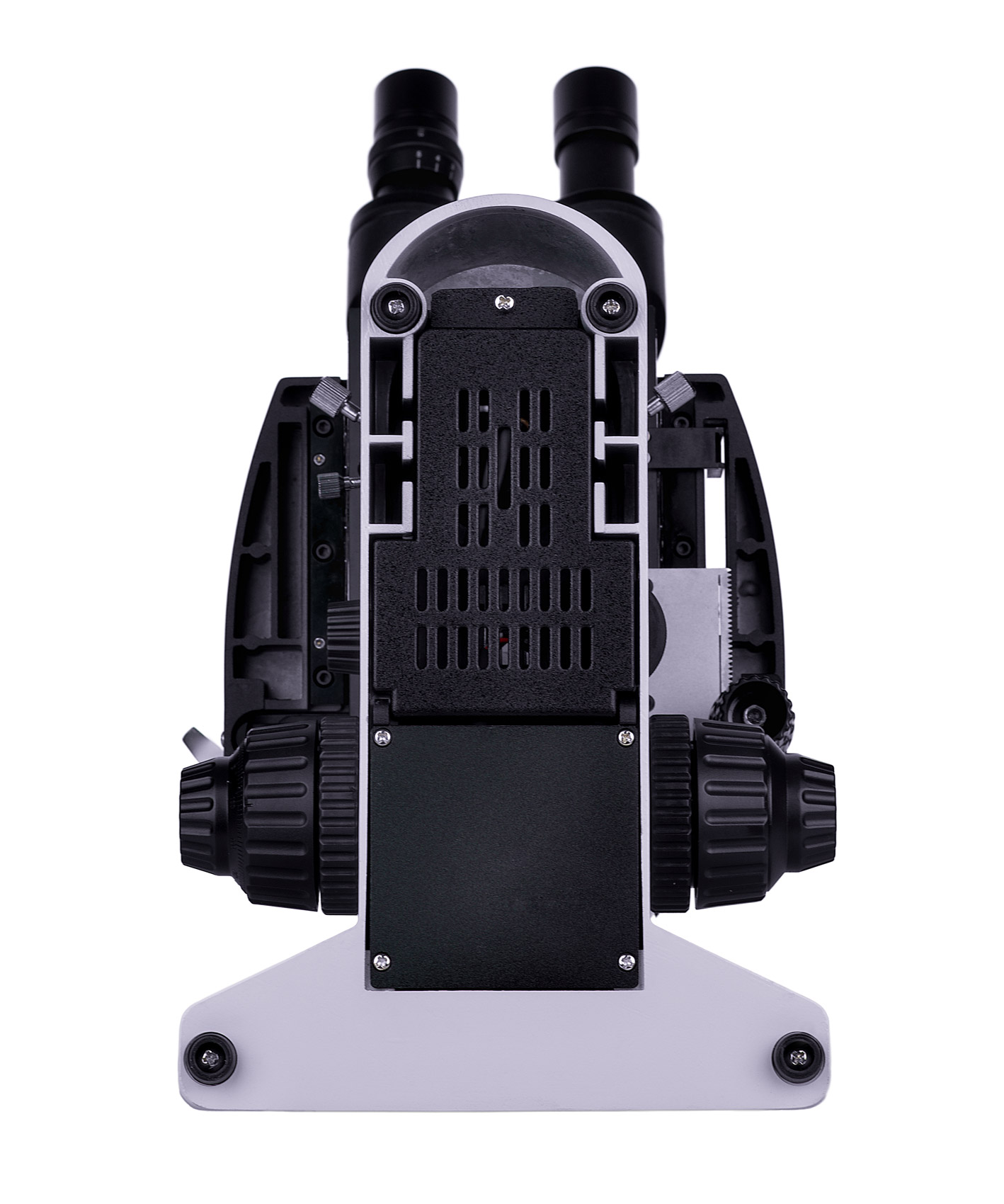 - Podstawa z wbudowanym zasilaczem, źródło światła przechodzącego, mechanizm regulacji ostrości, stolik, uchwyt kondensora i miska rewolwerowa
