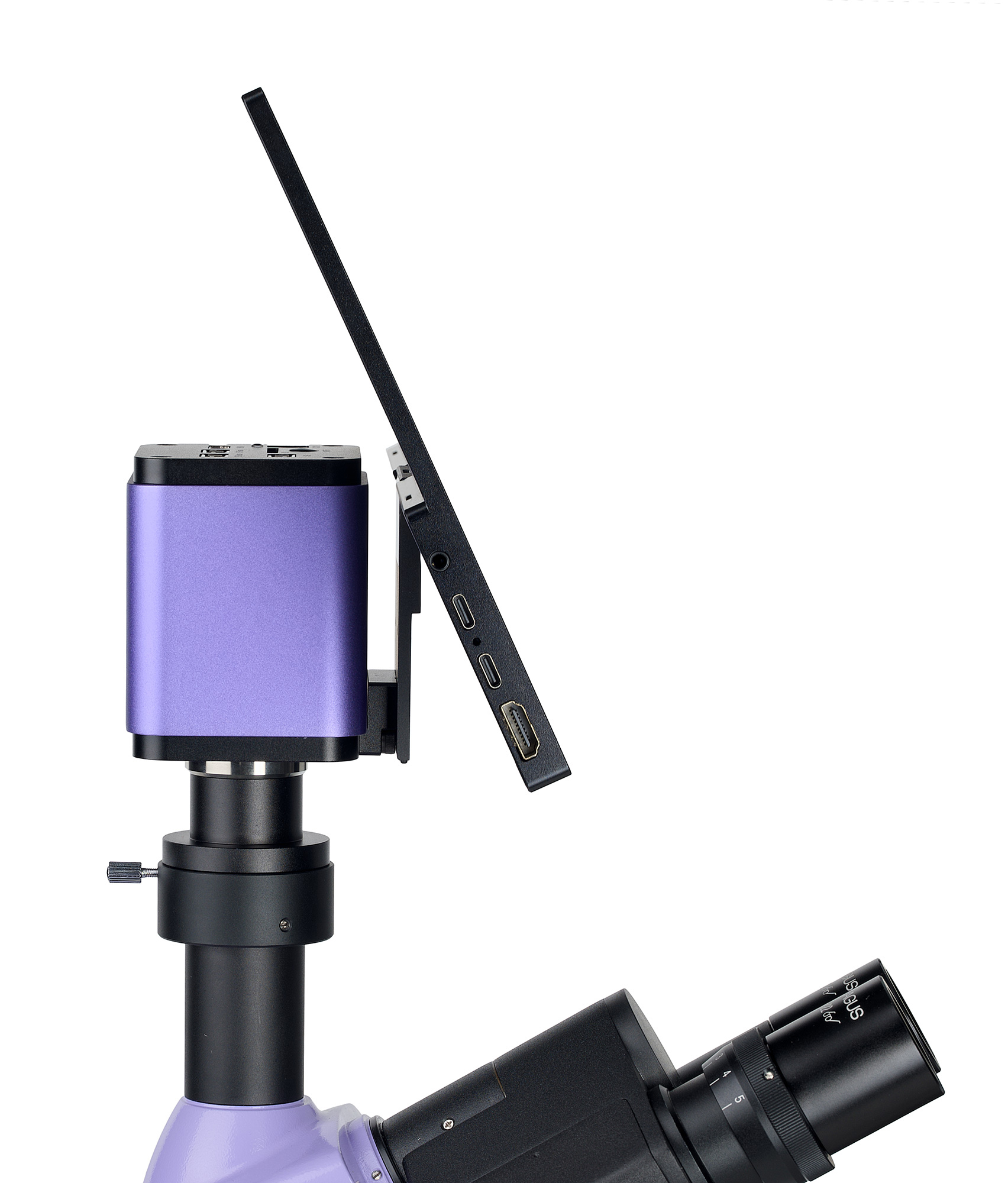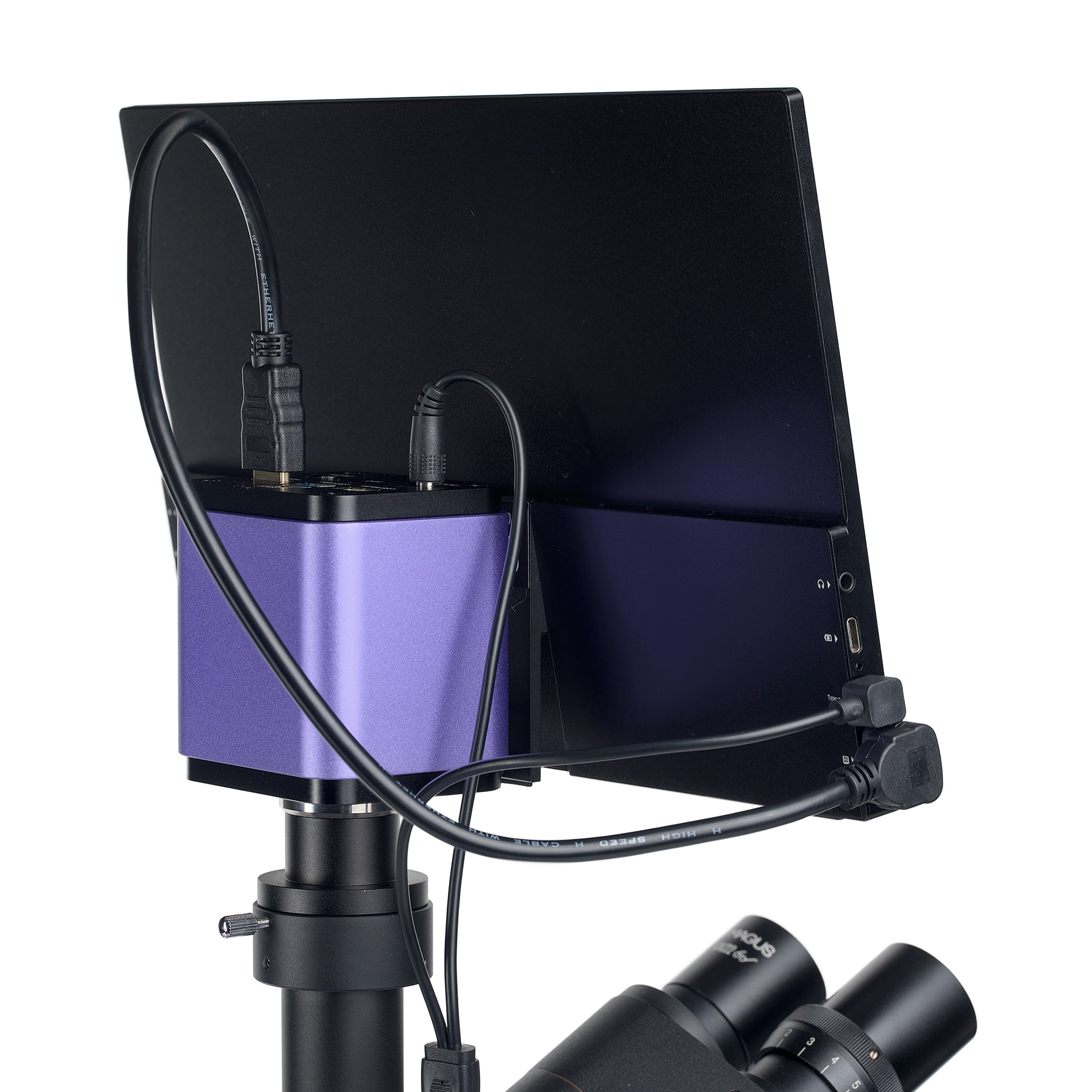 Wyświetlacz można umieścić na składanym stojaku na stole lub półce albo zamontować bezpośrednio na kamerze lub statywie mikroskopu.
