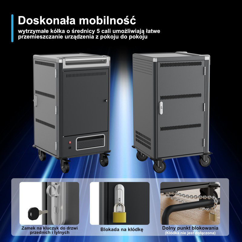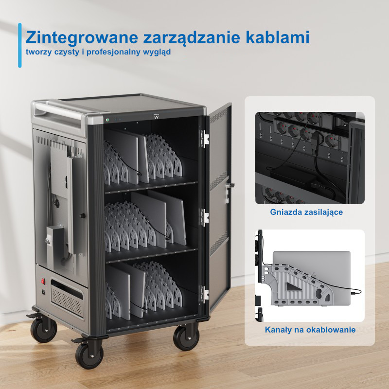 dzięki przejrzystej numeracji miejsc i dedykowanym przestrzeniom na zasilacze, personel IT może łatwo śledzić i utrzymywać sprzęt. Redukuje to czas potrzebny na codzienne przygotowanie urządzeń do pracy czy zajęć edukacyjnych i zwiększa produktywność zespołów.