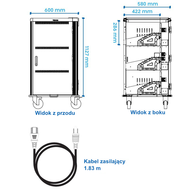 • Pojemność szafy: 30 dedykowanych slotów (po 10 na każdej z 3 półek) na tablety, notebooki lub laptopy o wielkości do 15.6″