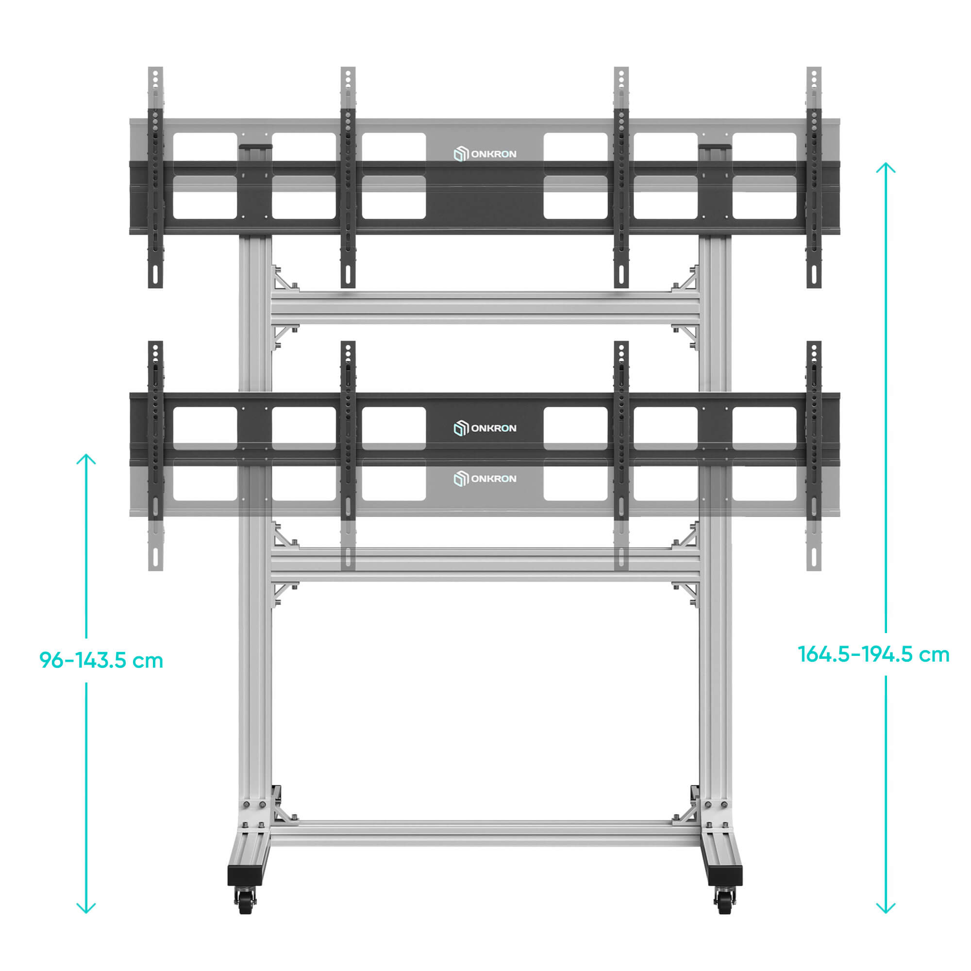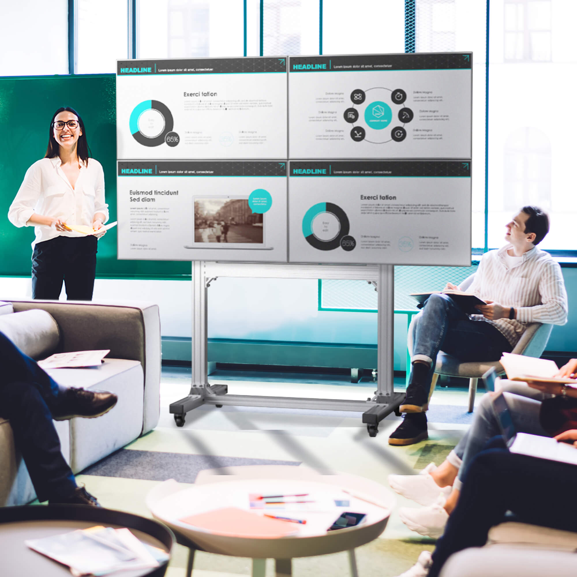The FSPRO2L-22 ma wytrzymałą aluminiową ramę z regulowanymi wspornikami do montażu telewizora, stabilną podstawę z czterema blokowanymi kółkami. Zastosowania: montaż czterech ekranów na mobilnym wózku jest inteligentnym i łatwym rozwiązaniem dla biznesu, sal konferencyjnych i sal posiedzeń, sal lekcyjnych, profesjonalnych organizacji non-profit i organizacji społecznych, wystaw, placówek edukacyjnych i obiektów rozrywkowych