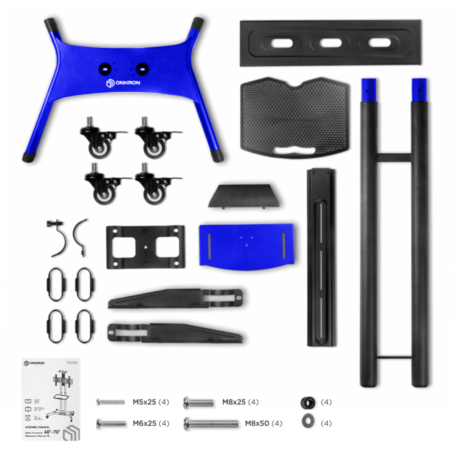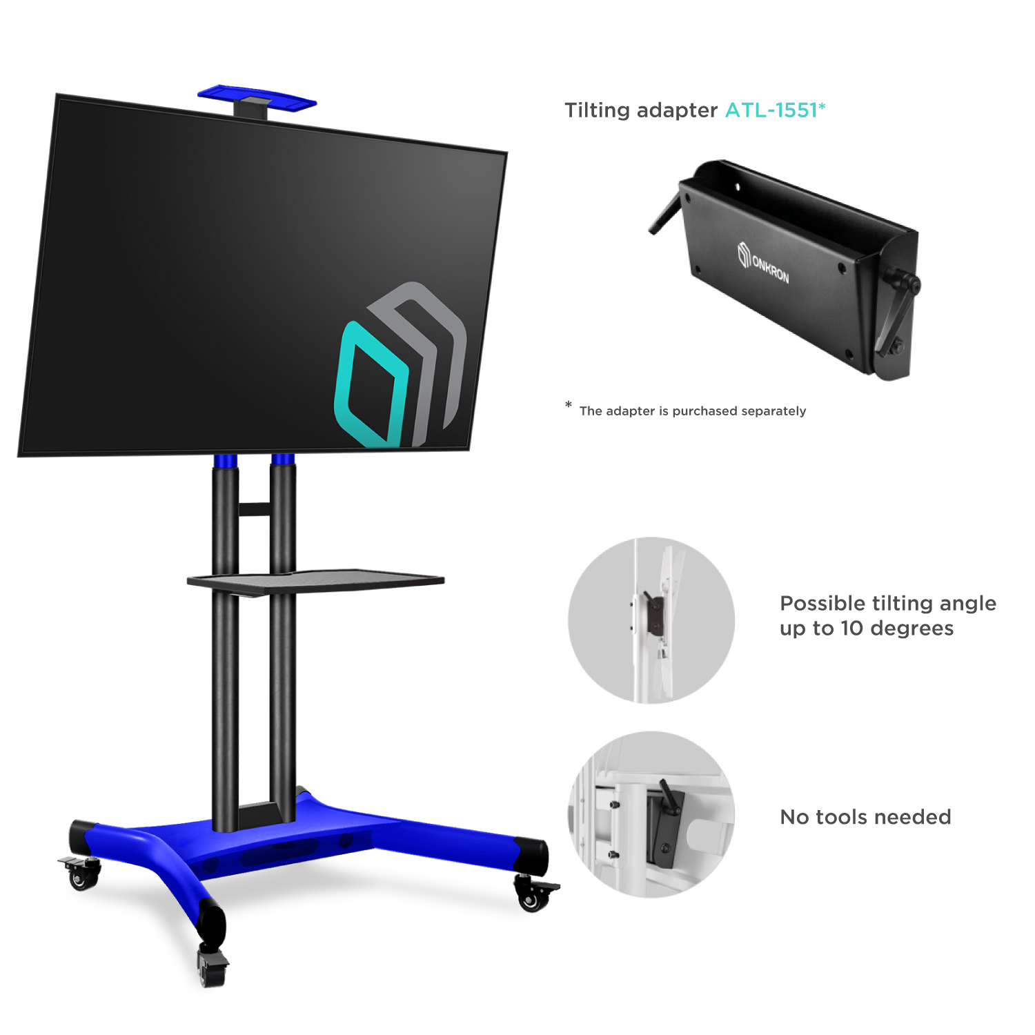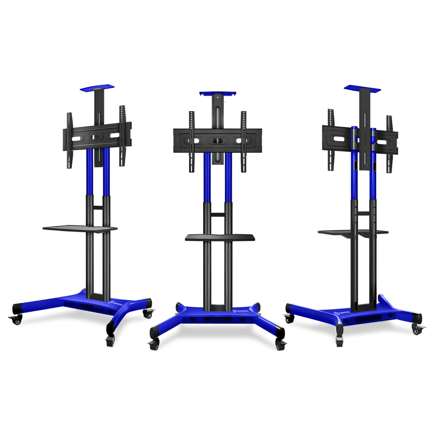 Nowa wersja flagowego modelu ONKRON TS1551, TS1551 Niebieski, to mobilny stojak do telewizora zaprojektowany dla najpopularniejszych rozmiarów ekranów od 40″ do 70 cali. Mobilność nigdy nie dawała tyle satysfakcji. Wystarczy przemieścić stojak w dowolne miejsce. Zapomnij o nieruchomym ekranie podczas wideokonferencji. Dokonywanie drobnych zmian położenia ekranu ze względu na słońce i odblaski nigdy nie było tak łatwe. Wszystkie nasze urządzenia mają półki zaprojektowane tak, aby pomieścić kamery internetowe, konsole do gier wideo, urządzenia do przesyłania strumieniowego i wiele innych.