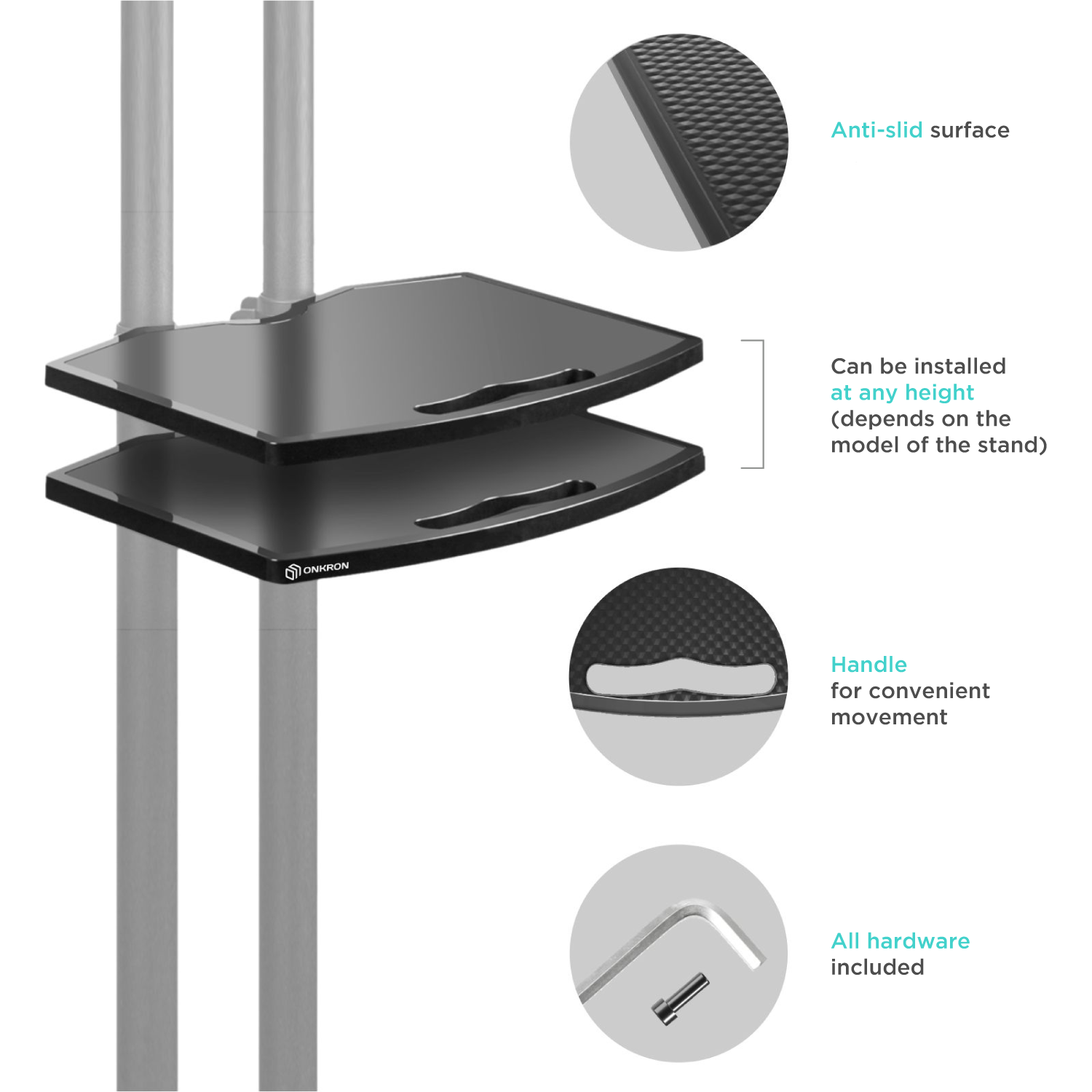 W zestawie znajdują się 2 półki na Twoje akcesoria o nośności do 4,5 kg każda na sprzęt audio-wideo, odbiorniki, akcesoria do gier lub laptopa oraz mniejsza półka na górze, o nośności 4,5 kg, często używana na kamerę internetową.