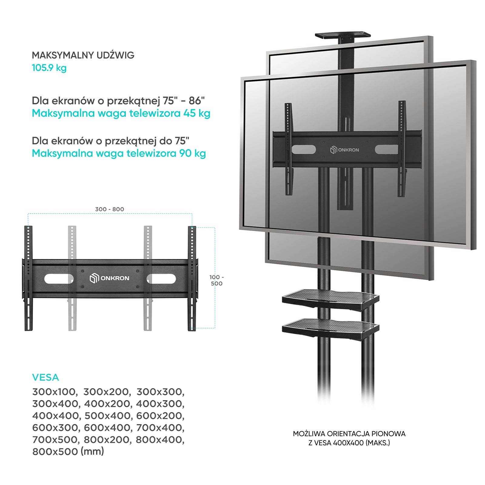 Uchwyt jest przeznaczony do mocowania paneli o różnych rozmiarach VESA – od małych 300×100 do największych 800×500 mm.