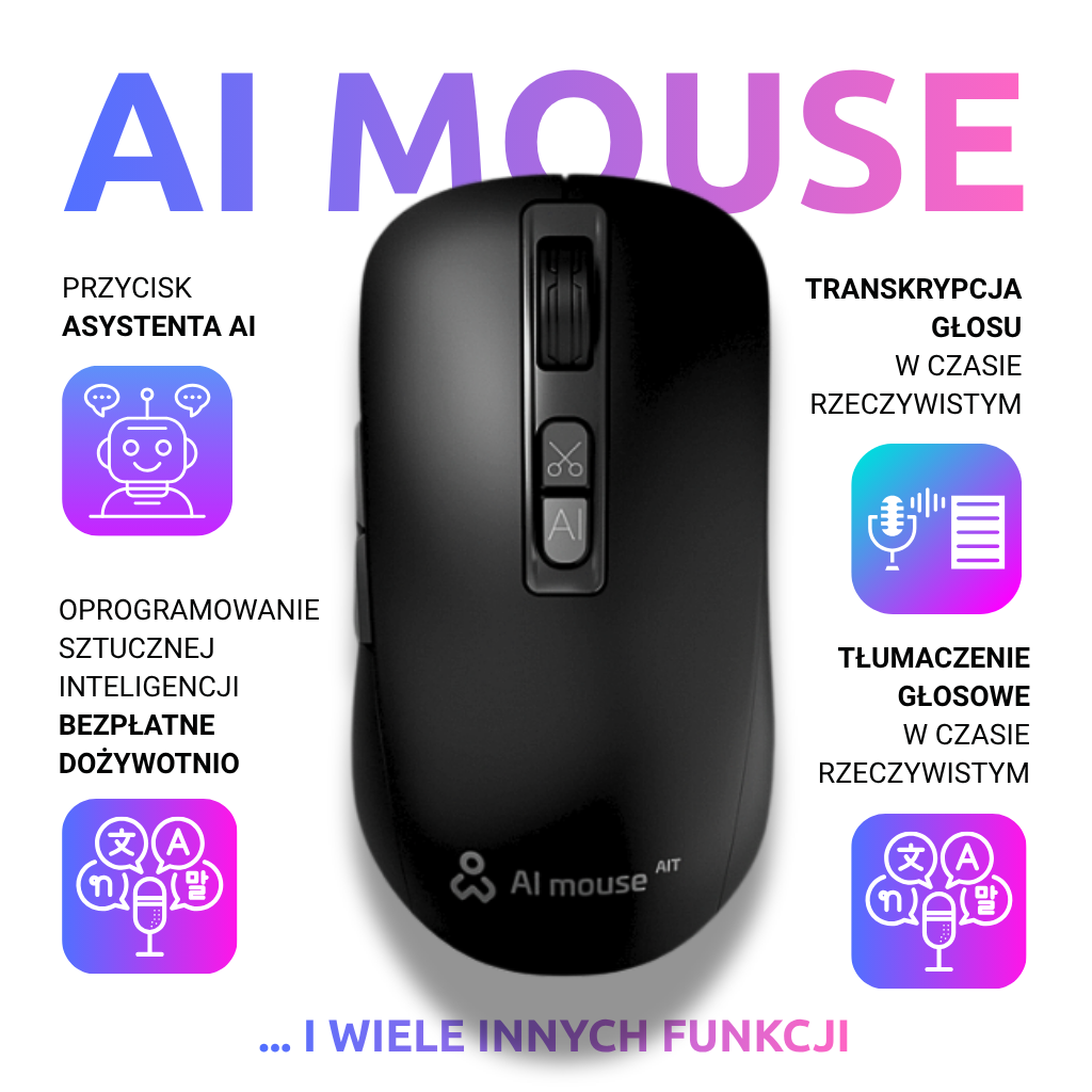 Przekształć swoje miejsce pracy w wydajne i kreatywne środowisko dzięki AI Mouse AIT. Ta mysz to nie tylko narzędzie, to rewolucja w codziennym korzystaniu z technologii. Nie przegap okazji, aby być jednym z pierwszych, którzy doświadczą prawdziwej mocy sztucznej inteligencji na wyciągnięcie ręki. Zamów już dziś i poczuj różnicę.
