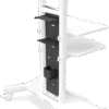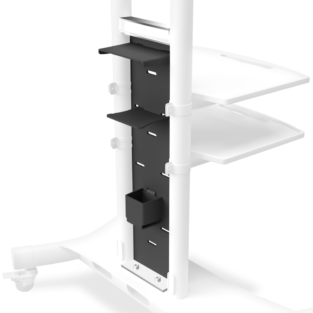 • Ten zestaw akcesoriów składa się z akrylowego panelu pionowego montowanego na podstawie wózka, plastikowej półki na urządzenia, uchwytu do zwijania kabli i szklanki na akcesoria.