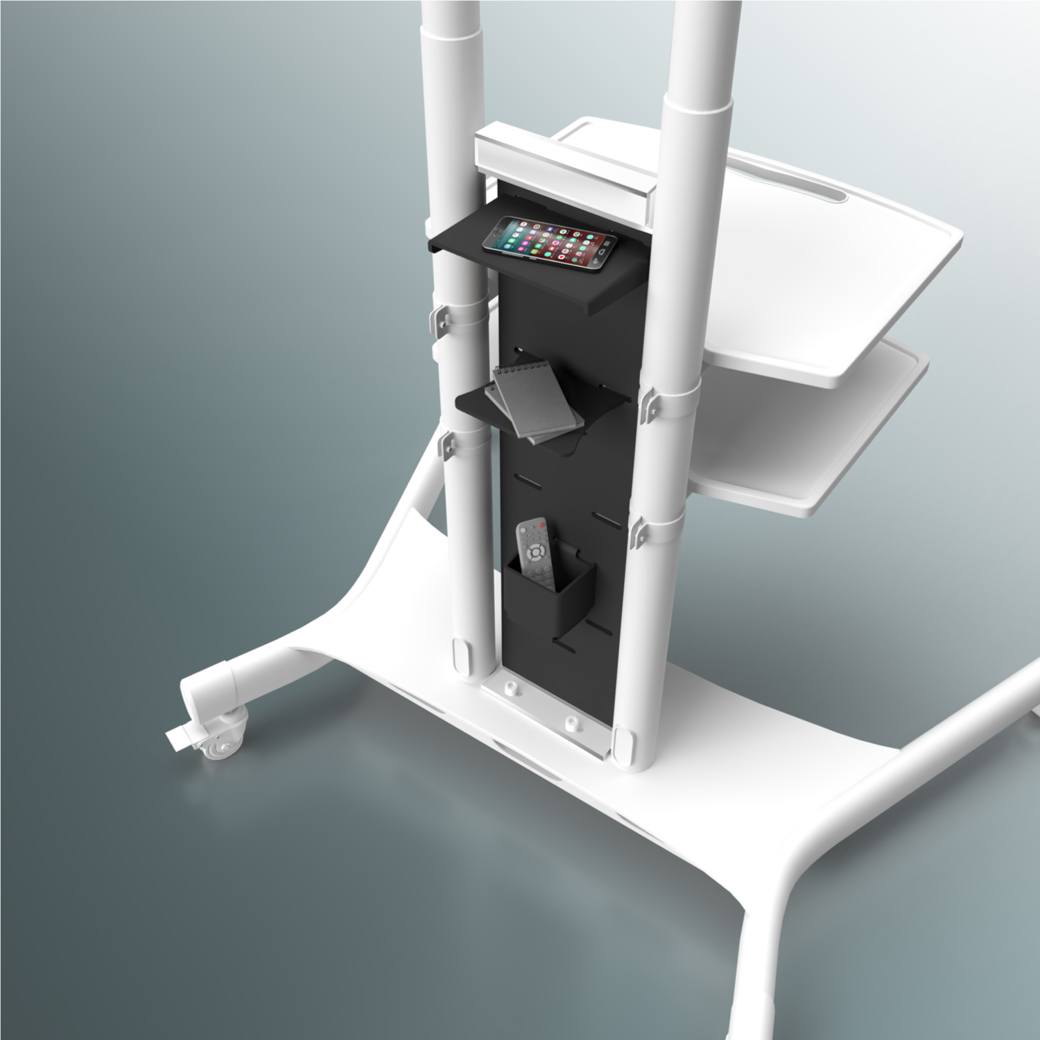 APP1881 to prosty, ale przydatny dodatek do mobilnego stojaka TV TS1881. Składa się z głównego panelu pionowego i następujących dodatków: plastikowej półki na urządzenia, uchwytu do zwijania kabli i szyby na akcesoria. Jest prosty i użyteczny. Mocne tworzywo sztuczne zapewnia nośność 4,4 funta na każdy element. Nie musisz wybierać półek, ponieważ APP1881 nie koliduje z głównymi środkowymi półkami podstawy telewizora ONKRON.