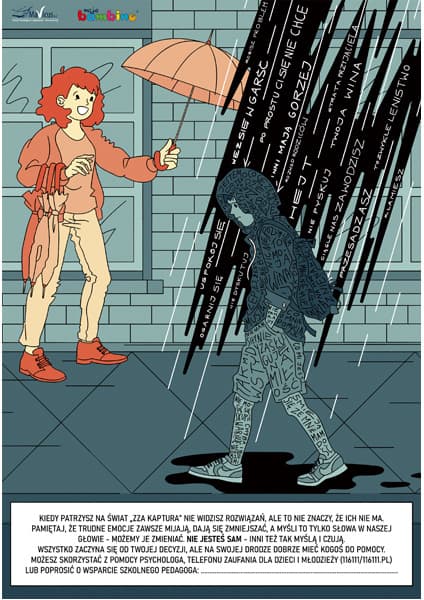 Niektóre zachowania nastolatków odbierane są przez otoczenie jako przejaw buntu, efekt dojrzewania, a w rzeczywistości są wynikiem przewlekłego utrzymywania się u dzieci niepokojących uczuć i myśli. Sprawia to, że nastolatkowie często mają poczucie bycia niezrozumianym oraz przekonanie, że dzieje się z nimi coś niedobrego, co dotyczy tyko ich i z czym muszą się borykać samotnie. Plakat skierowany jest do uczniów starszych klas szkoły podstawowej – jego celem jest wskazanie dzieciom, że to co czują i myślą dotyczy wielu ich rówieśników oraz że warunkiem poradzenia sobie z problemową sytuacją jest wyrażenie swoich potrzeb, uczuć i znalezienie pomocy w najbliższym otoczeniu.