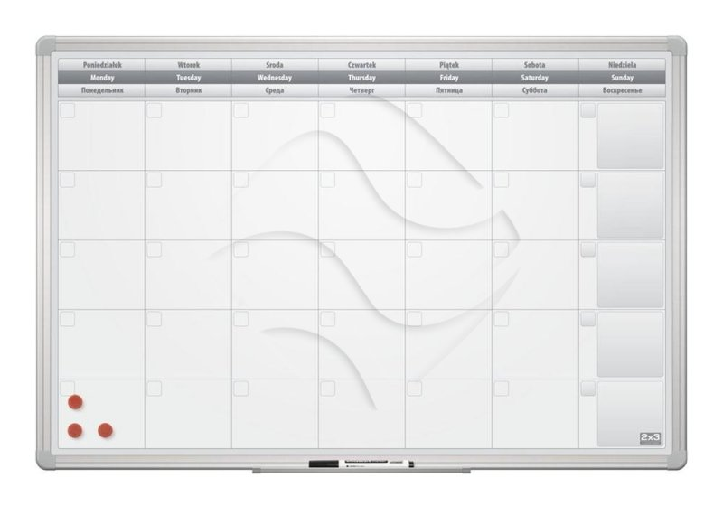 Charakterystyka: Tablica suchościeralna z powierzchnią lakierowaną o właściwościach magnetycznych. Na powierzchni znajduje się stały nadruk terminarza miesięcznego, który ułatwia planowanie zadań indywidualnych jak i zespołowych w określonych odstępach czasowych. Rama z profilu aluminiowego w kolorze srebrnym, wykończona eleganckimi, popielatymi narożnikami. Produkt wyposażono w wygodną półkę o długości 30 cm, która zmieści wszelkiego rodzaju przybory niezbędne podczas prezentacji. Uwaga: istnieje możliwość dokupienia samoprzylepnych szyldów.