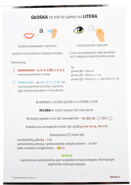 Na plakacie w ciekawy graficznie sposób zostały przedstawione podstawowe informacje dotyczące relacji między głoską a literą oraz definicje sylaby i wyrazu. Konkretne wiadomości zostały również poparte przykładami.