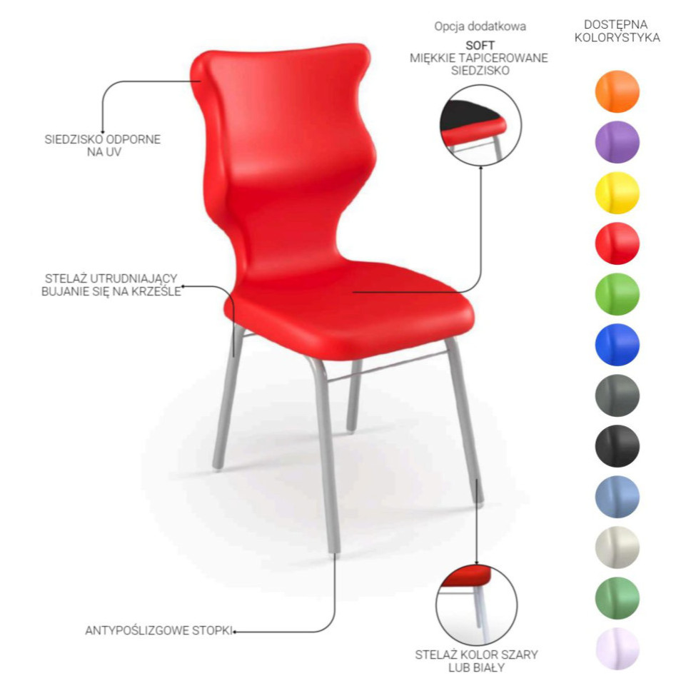 Classic to dobre krzesło wyposażone w ergonomiczne siedzisko z tworzywa sztucznego i stelaż w kolorze popiel zakończonym antypoślizgowymi zatyczkami. Siedzisko ma z tyłu uchwyt do szybkiego przenoszenia krzesła. Krzesło Classic dostępne w rozmiarach 4-6 by optymalnie dostosować je do wzrostu osoby w celu zachowania prawidłowej postawy siedzącej podczas użytkowania.