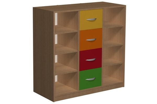 • Szafa posiadająca 8 półek w 2 skrajnych częściach i 4 szufaldy pośrodku.