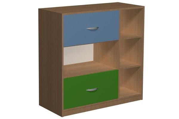 • Szafka posiadająca 3 otwarte przestrzenie z prawej strony i dwie szerokie szuflady z półką pomiędzy nimi z lewej.