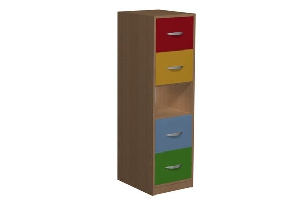 - Szafka posiadająca 4 szuflady i 1 otwartą półke w środkowej części.