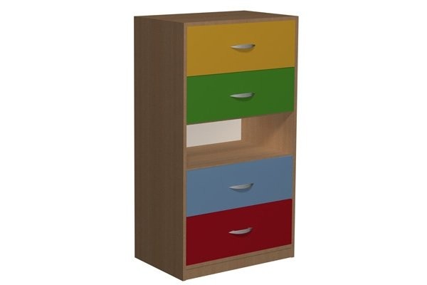 • Szafka posiadająca szeroką, otwartą półkę w środkowej części i 4 szuflady.