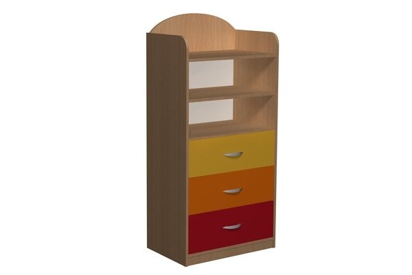 - Szafka z nadstawką posiadająca 2 szerokie półki w górnej części i 3 szuflady poniżej.