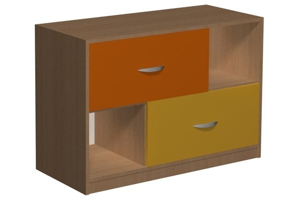 - Szafka posiadająca 2 szerokie szuflady i 2 otwarte skrytki.