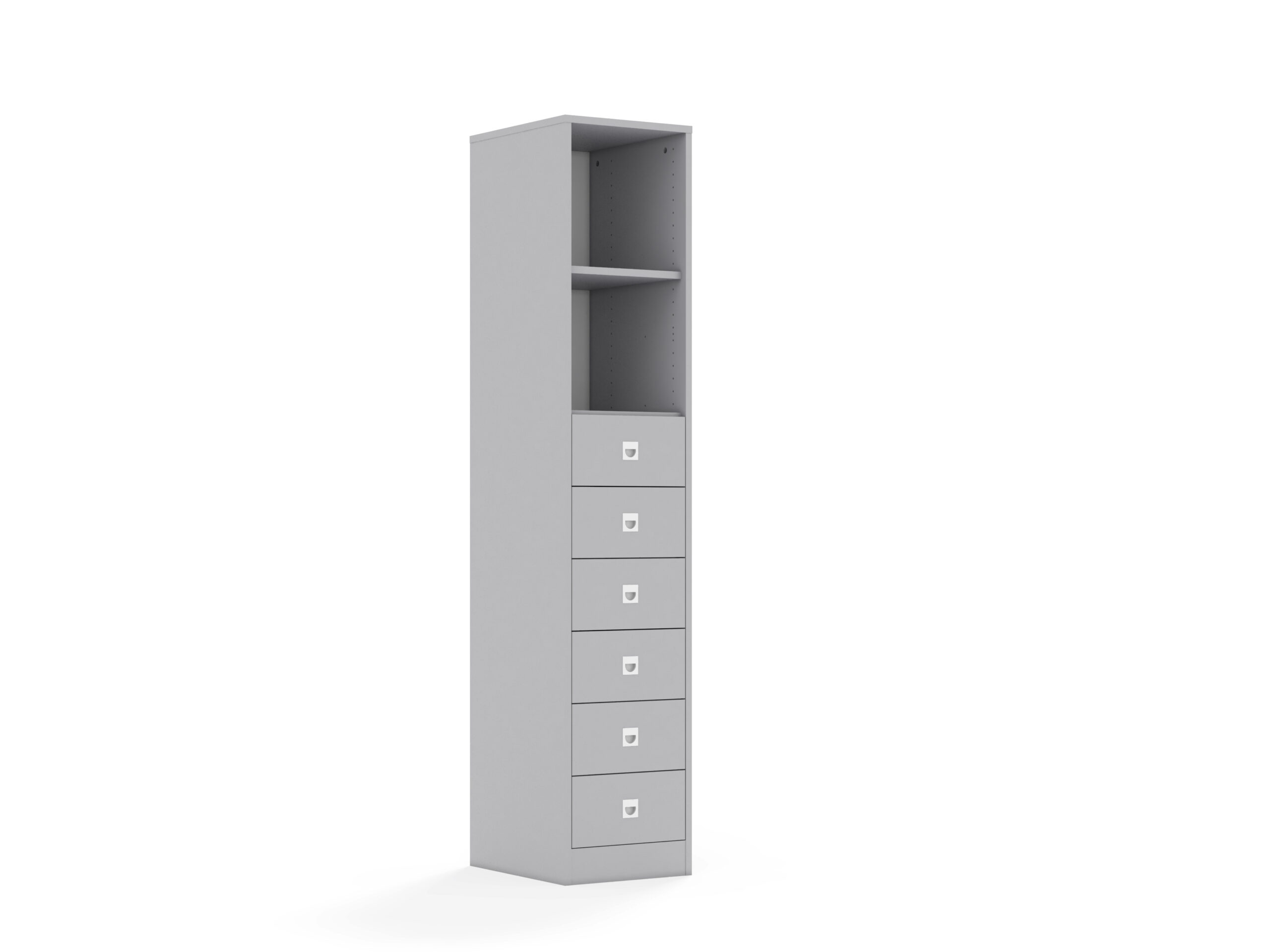 Szuflada wykonana z płyty melaninowanej o grubości 18 mm o klasie higeniczności E1. Dostępne kolory: biały, szary, dąb kamienny. Metalowe prowadnice z wysokogatunkowej stali, wyposażone w funkcję samodociągu, zapewniają trwałość, wytrzymałość oraz płynne i ciche zamykanie. Mechanizm automatycznie domyka szufladę po lekkim popchnięciu, gwarantując wygodę i bezszelestne użytkowanie. Plastikowy uchwyt w kolorze białym, osadzony w płycie meblowej. Jego płaska konstrukcja zapewnia większe bezpieczeństwo użytkowania.