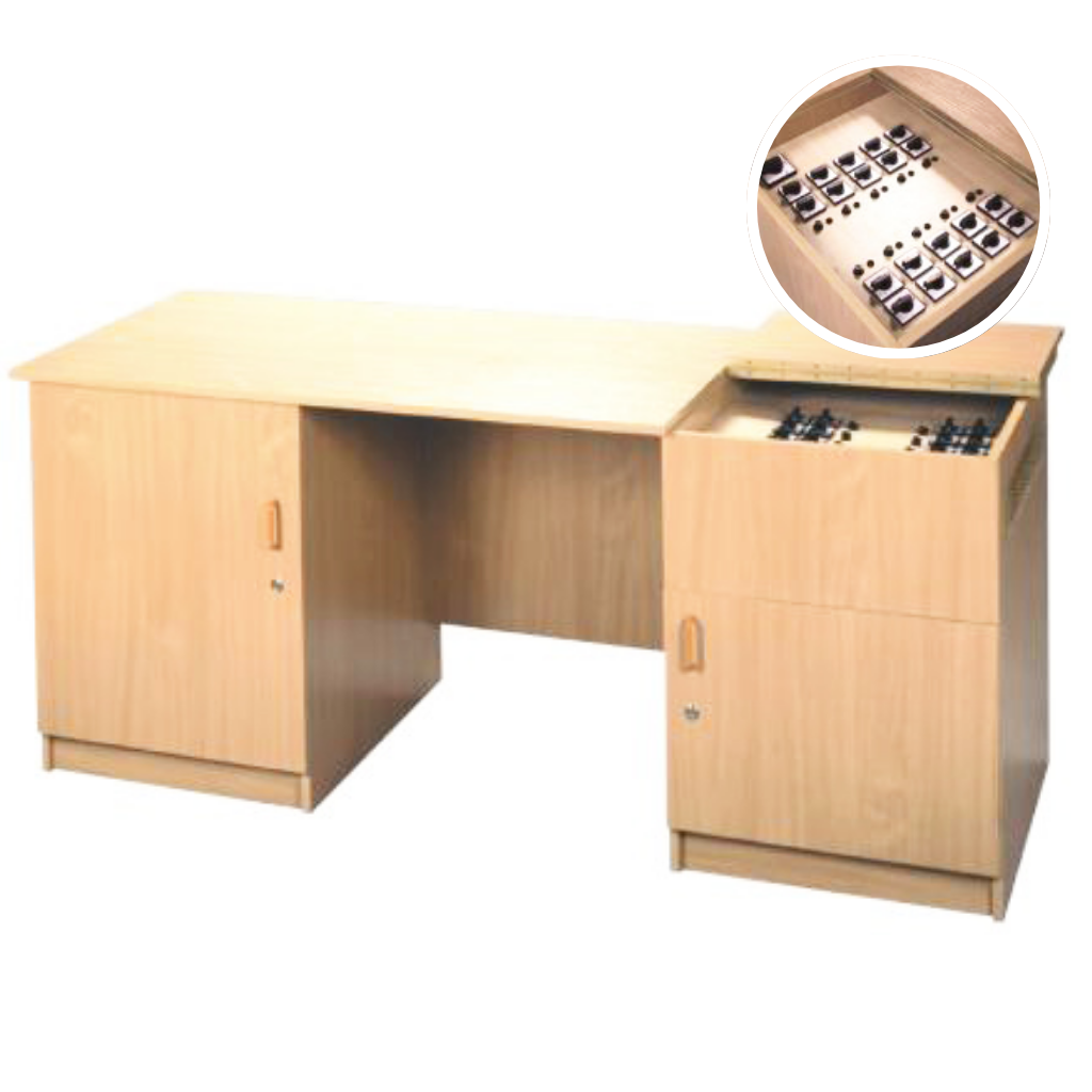 Stół demonstracyjny do pracowni wyposażony w przenośny zasilacz laboratoryjny prądu stałego i zmiennego z regulacją napięcia w zakresie 0-24V/ 6A, listwę zasilającą 230V/50Hz oraz pulpit sterujący przystosowany do zasilania 10 stanowisk uczniowskich napięciem stałym i zmiennym o parametrach: 3V/6V/5A; 9V/12V/3A.