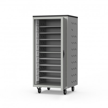 Wózek ten umożliwia jednoczesne ładowanie 10 laptopów o maksymalnej wielkości 17″ oraz ich bezpieczne przemieszczanie pomiędzy pomieszczeniami. Drzwi o kącie otwarcia 110° zapewniają wygodny dostęp do wnętrza, a kompaktowa, mobilna konstrukcja doskonale sprawdza się w szkołach, uczelniach, urzędach oraz salach konferencyjnych.