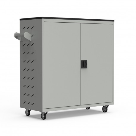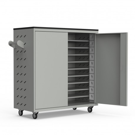 Wózek ten umożliwia jednoczesne ładowanie 20 laptopów o maksymalnej przekątnej 17″. Ułatwia bezpieczne przewożenie sprzętu pomiędzy pomieszczeniami, a drzwi z kątem otwarcia 110° zapewniają wygodny dostęp do wnętrza.