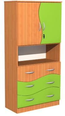 - Posiada 2 przestrzenie zamykane szafką z falą, 1 otwartą półkę oraz 3 szuflady.
