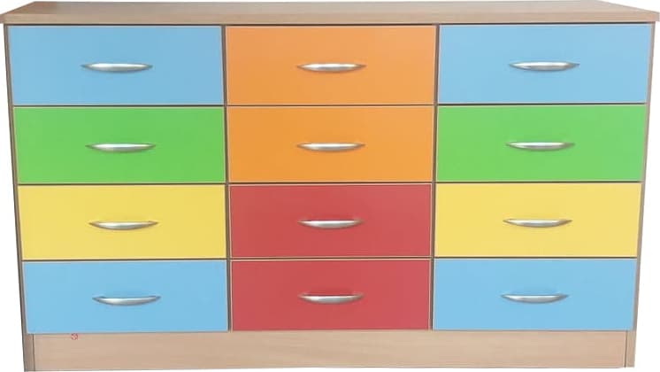Szafka z szufladami. Wykonana z płyty laminowanej, fronty kolorowe, gr. płyty 18 mm.