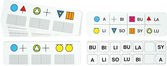 • kartoniki z sylabami – 14 szt. o wym. 2,5 x 2,5 cm