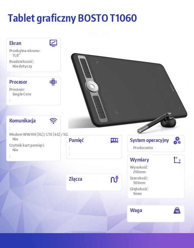 Tablet graficzny BOSTO T1060 to tablet piórkowy (bezekranowy, płytkowy), który może być wykorzystywany do tworzenia grafik cyfrowych, szkiców, odręcznych podpisów, nauki online, a także podczas prowadzenia prezentacji czy wykładów. Jak każdy tablet piórkowy, tablet ten nie ma wyświetlacza, lecz powierzchnię roboczą, po której kreśli się rysikiem. Efekty pracy widać na ekranie komputera lub smartfona.