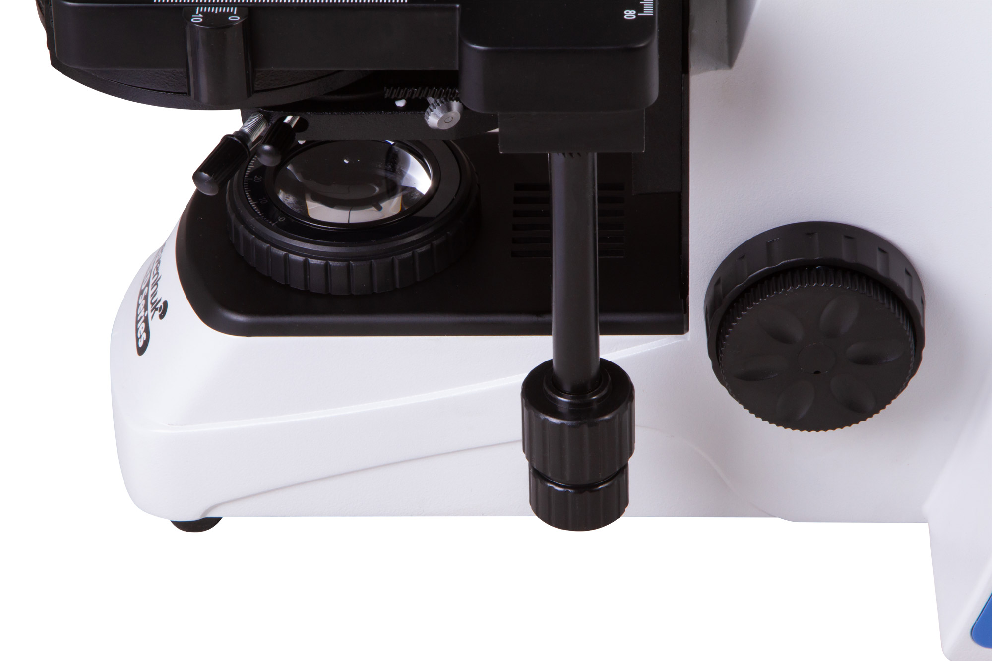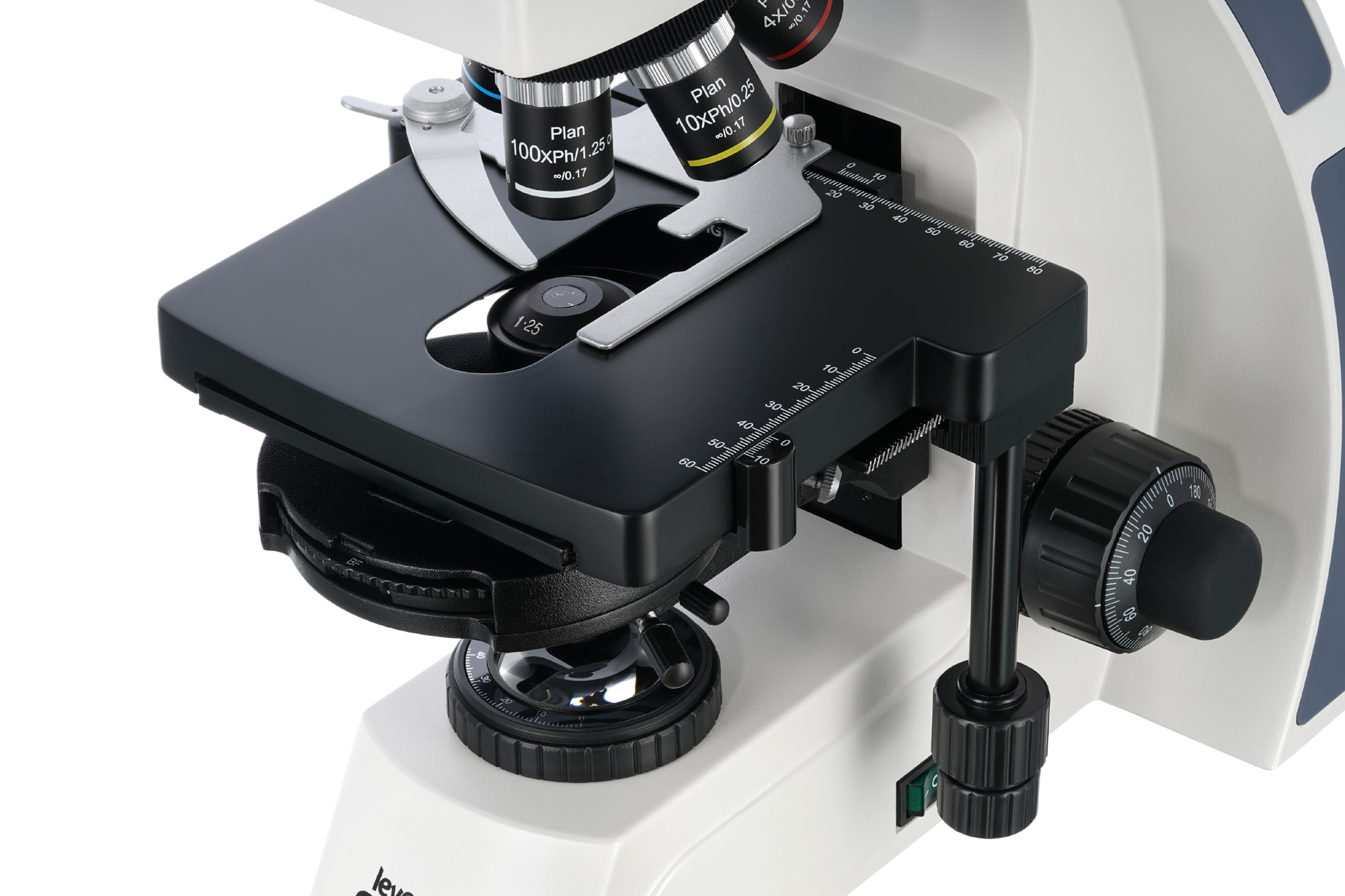 Regulowany w dwóch płaszczyznach stolik ma skalę mechaniczną. Pod stolikiem umieszczono kondensor kontrastowo-fazowy (metody ciemnego pola można używać tylko bez olejku immersyjnego), a poniżej niego zamontowano oświetlenie LED z regulacją jasności. Oświetlenie ma zasilanie sieciowe.