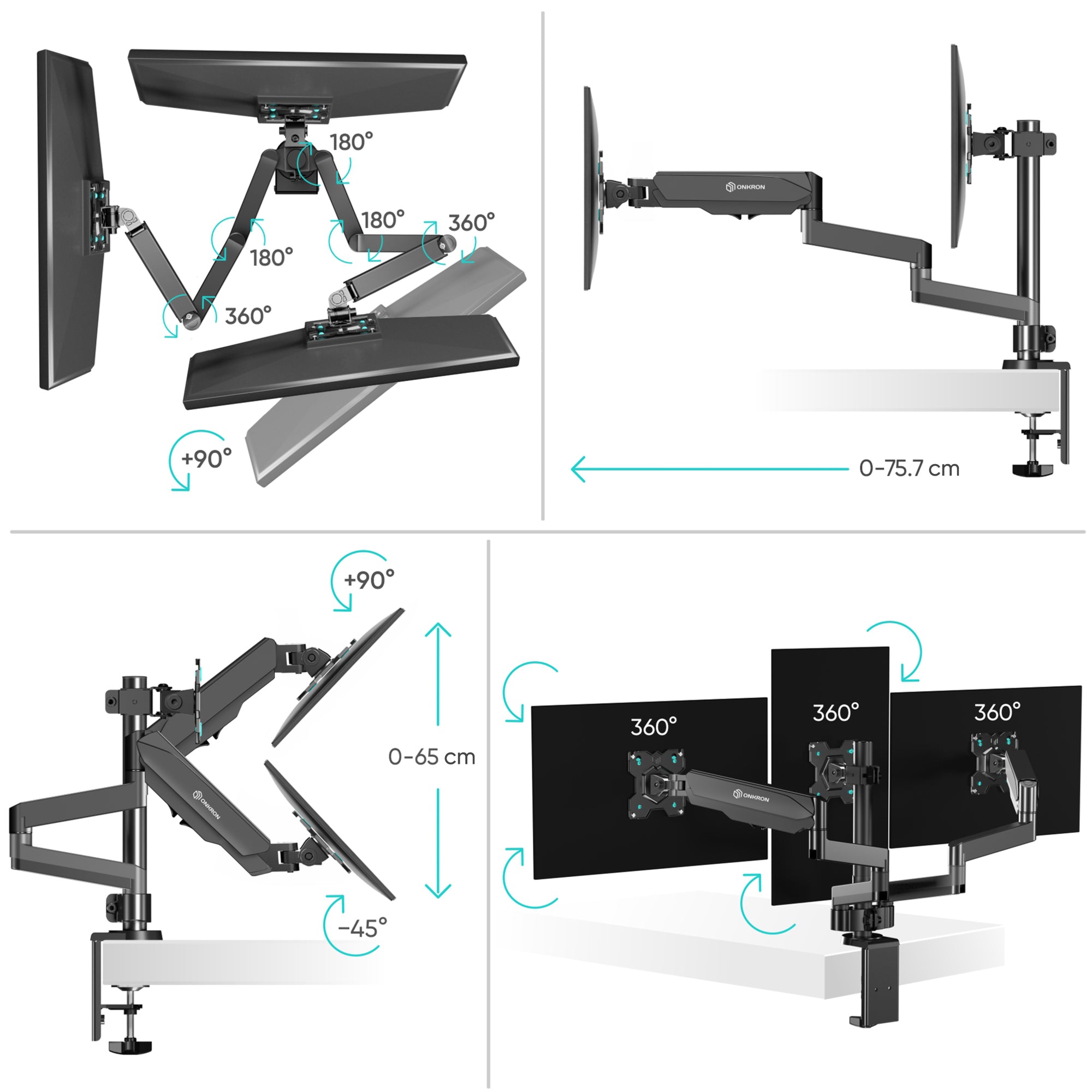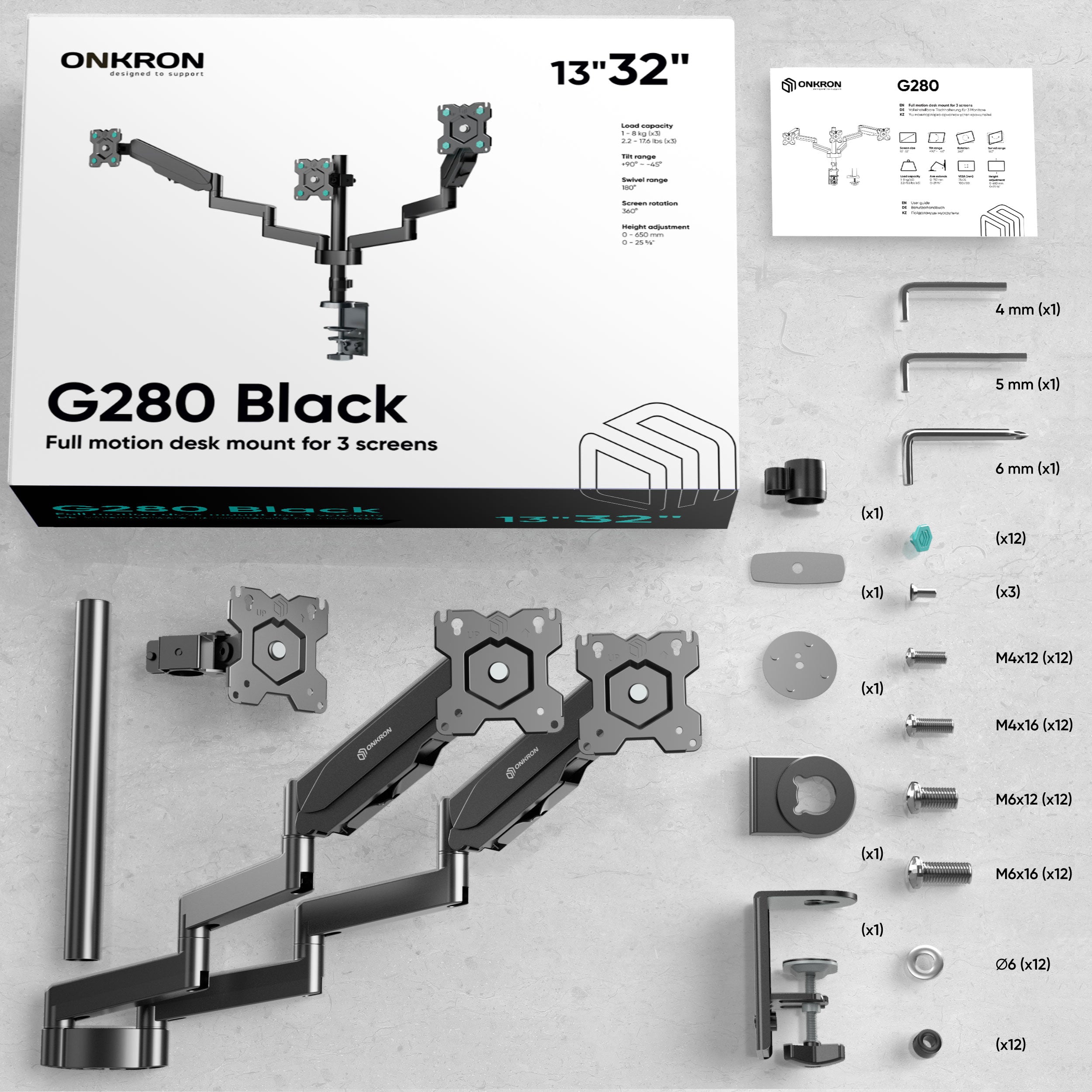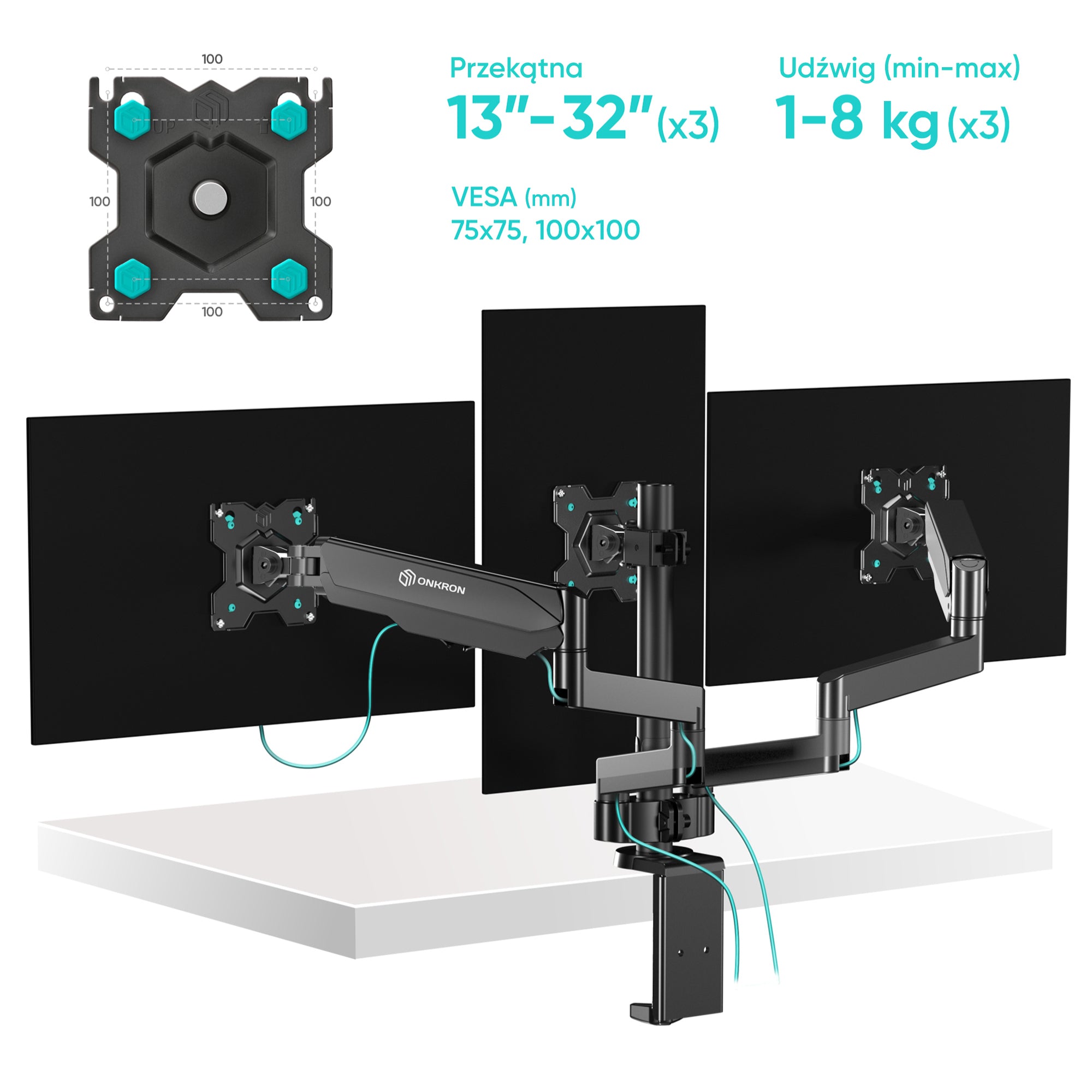 Uchwyt biurkowy dla trzech monitorów 13"-32" maks 8 kg, nachylny i obrotowy, z obracaniem, czarny G280